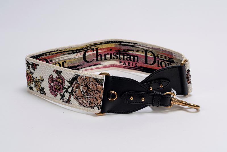 in tessuto color bianco con ricami floreali in colori diversi e pelle color nero, dettagli in metallo dorato, lung cm 81 X 6,5 con sacchettoBase d'asta