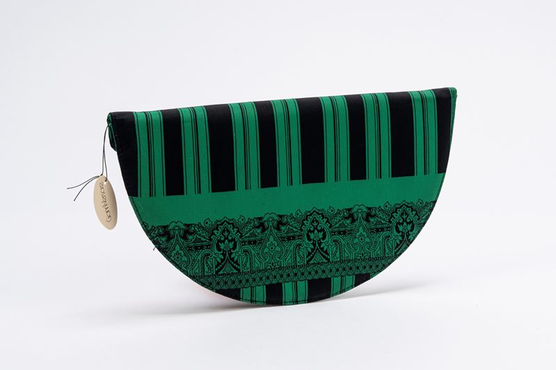 a mezzaluna in grosgrain stampa color verde e nero, cm 29, con sacchetto (lievissimi segni d'uso)