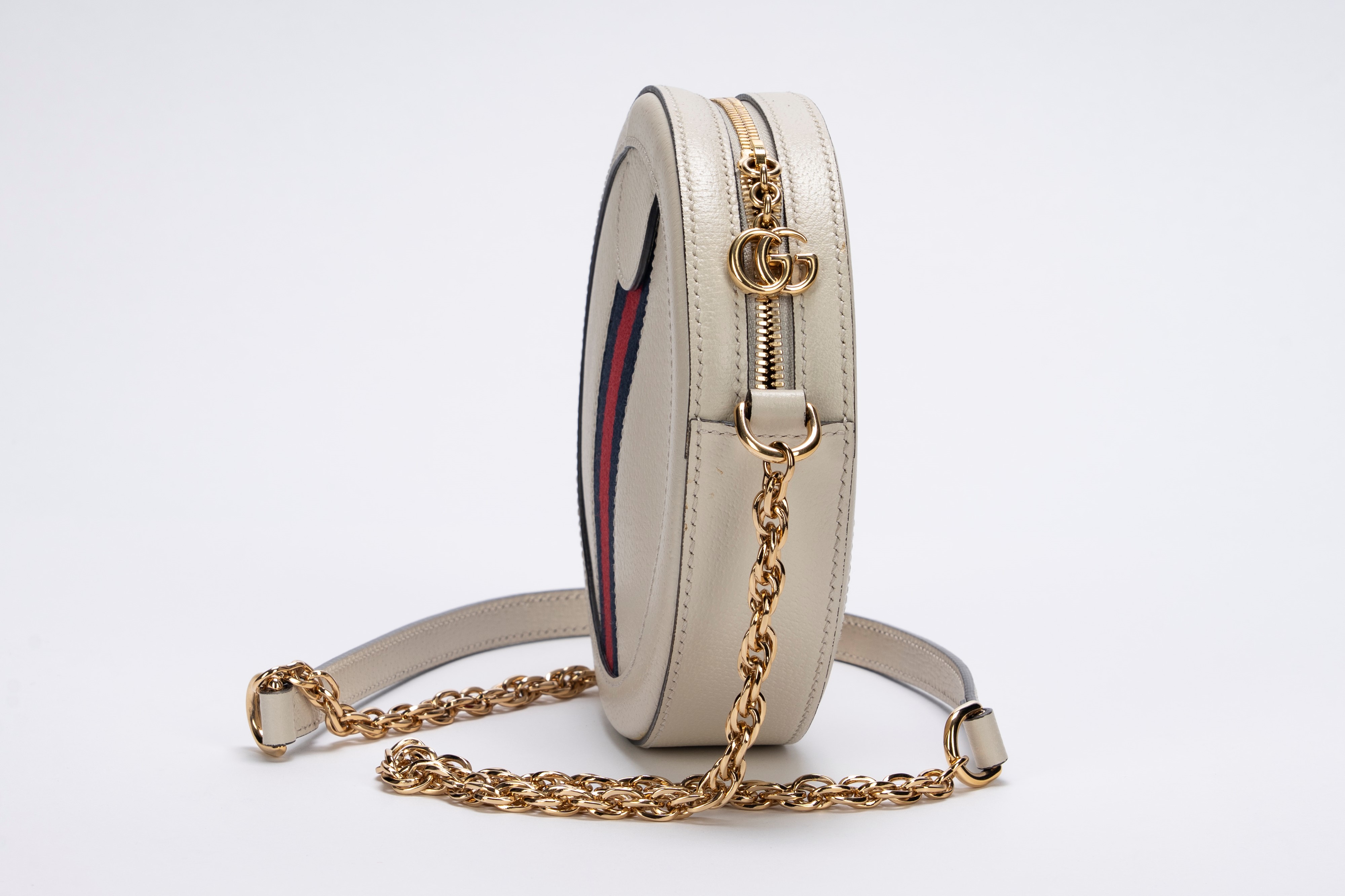 in pelle di cinghiale color crema, tracolla a catena in metallo dorato, banda web color rosso e blu, diametro cm 19, con sacchetto