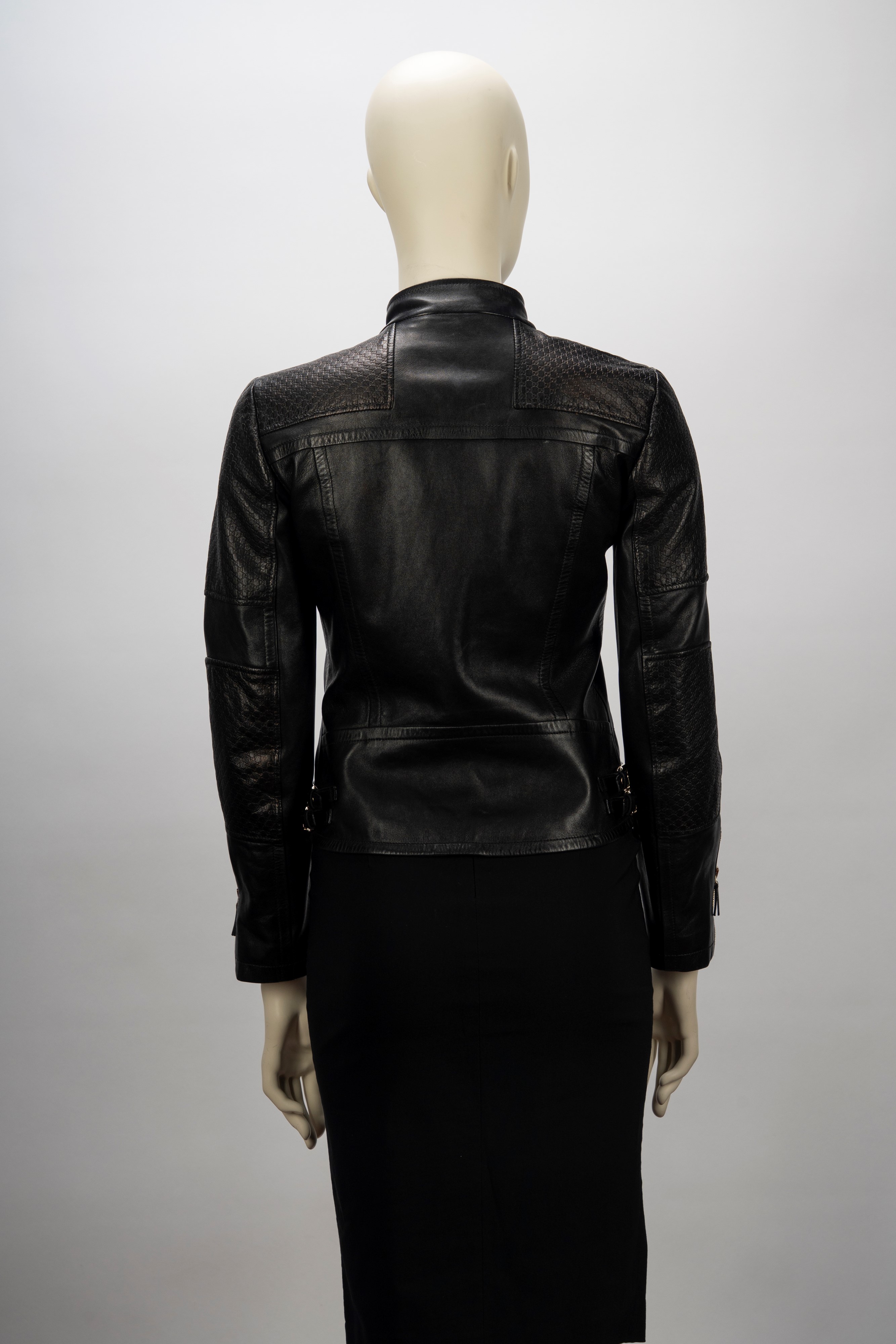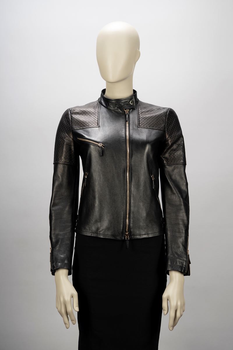 a manica lunga, in pelle bicolore nero e marrone, dettagli in metallo, chiusura a cerniera, fodera logata, taglia 40 (lievi segni d'uso)