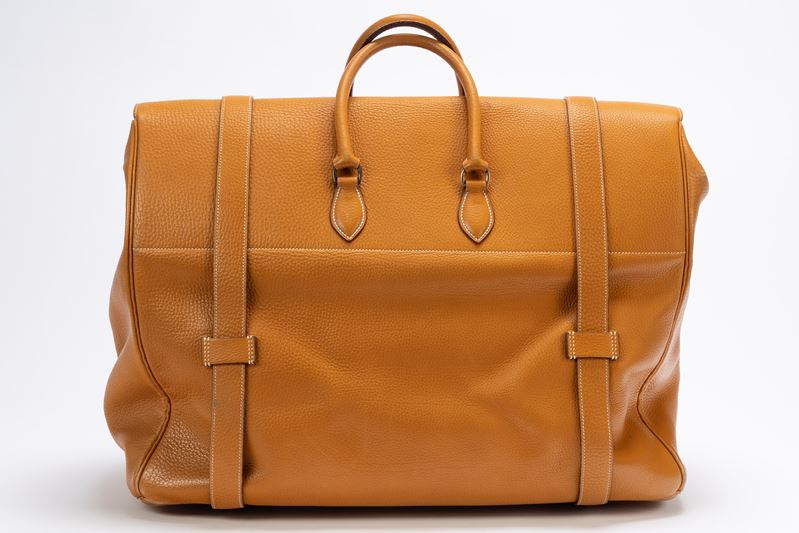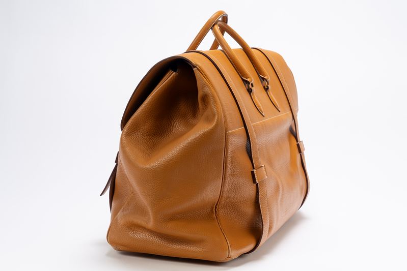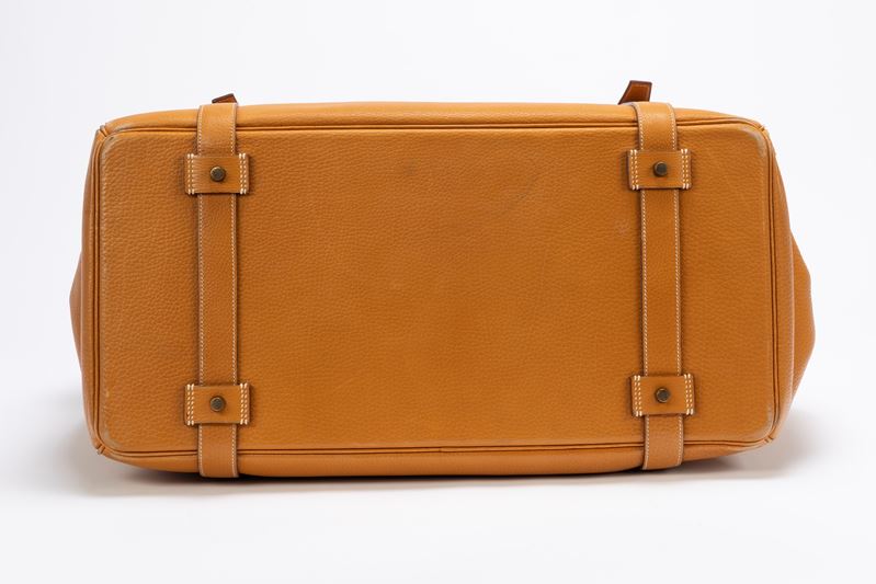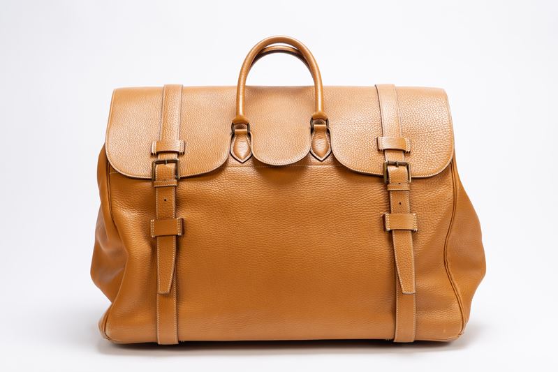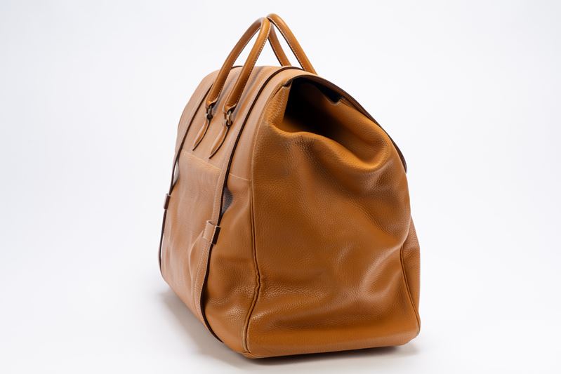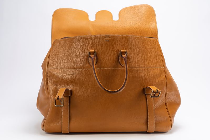 in vache naturelle, doppi manici, dettagli in metallo brunito, cm 55, iniziali P.S., con sacchetto (segni d'uso)Base d'asta