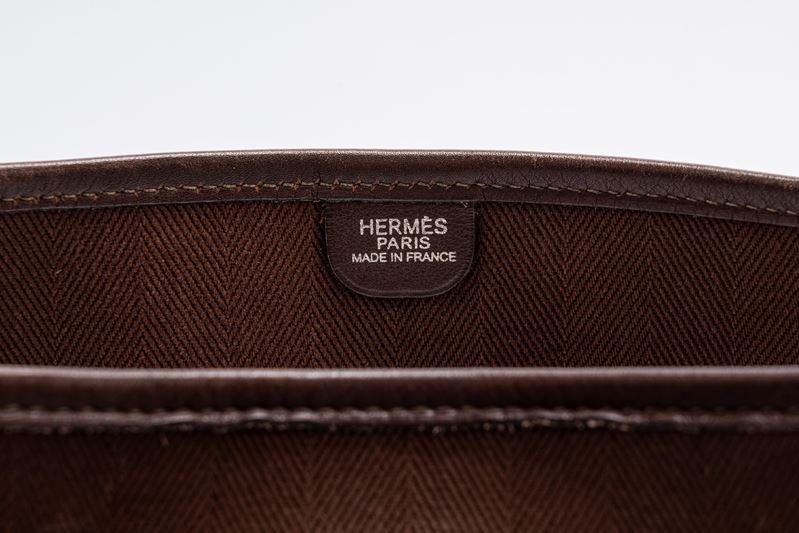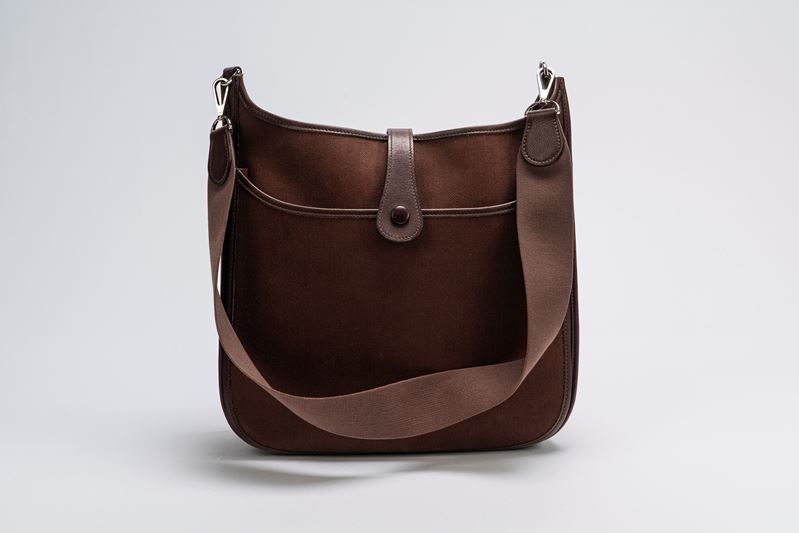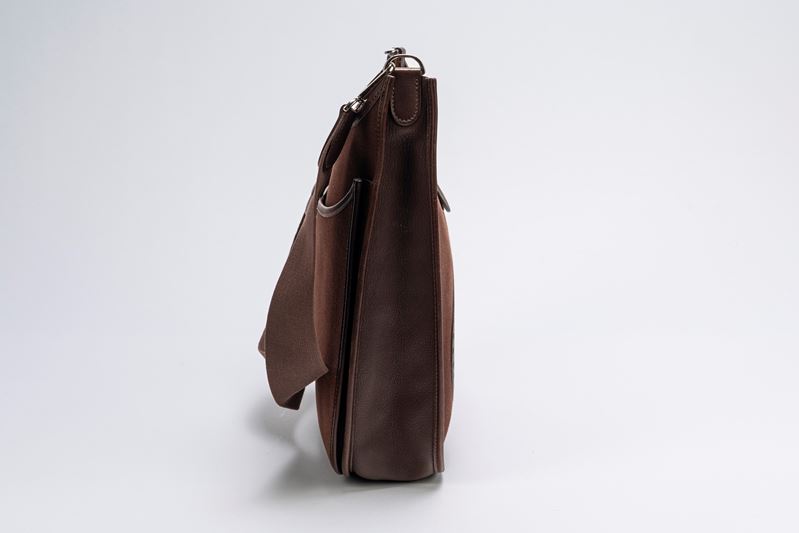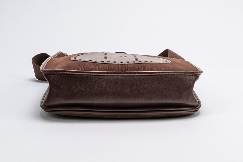 in tela e pelle color marrone, con tracolla staccabile, dettagli in palladio, cm 33 (lievi segni d'uso)
