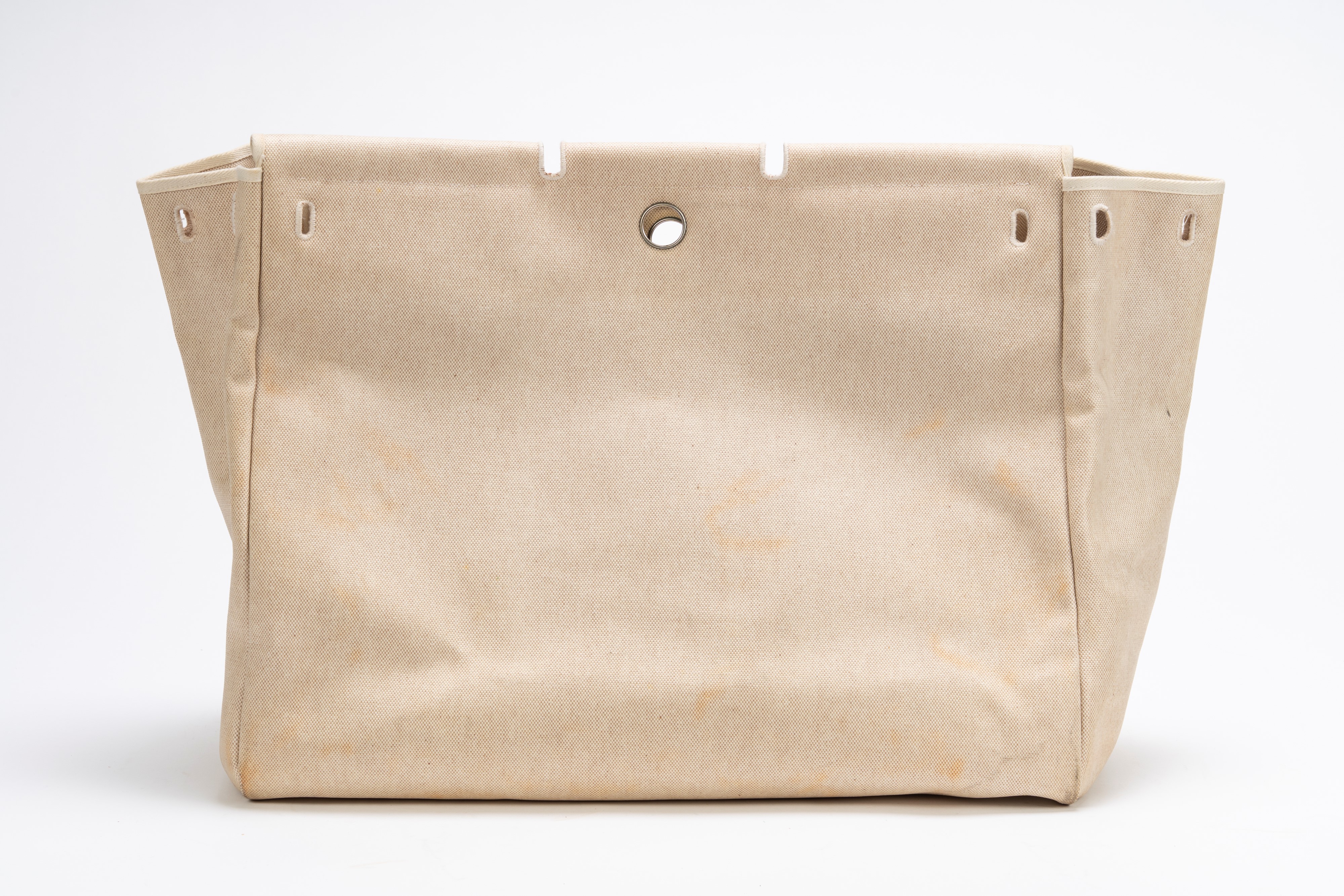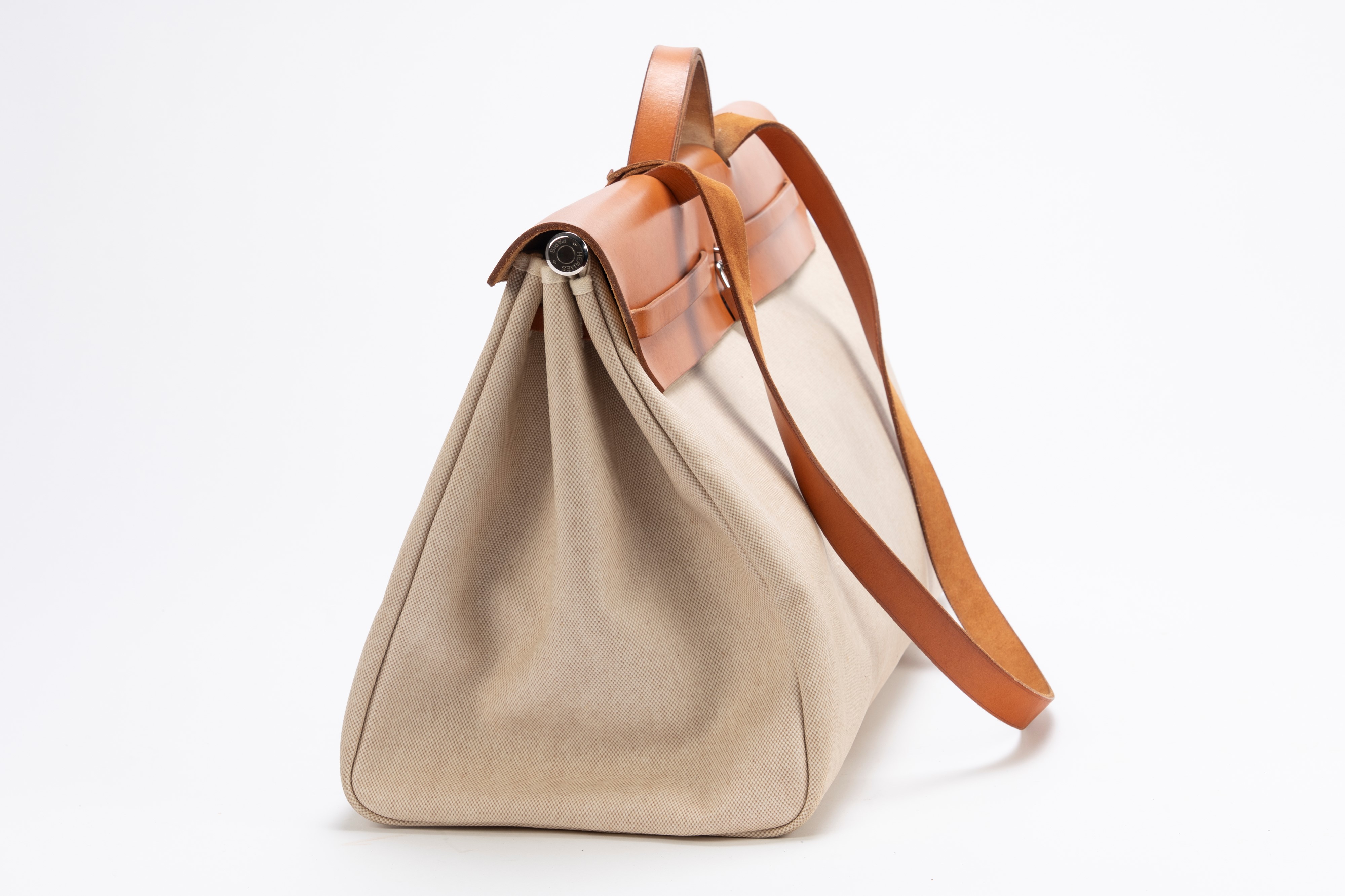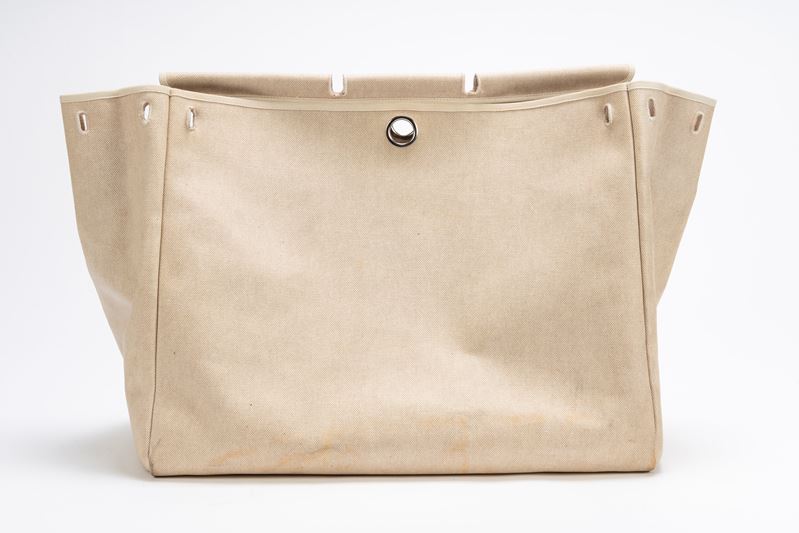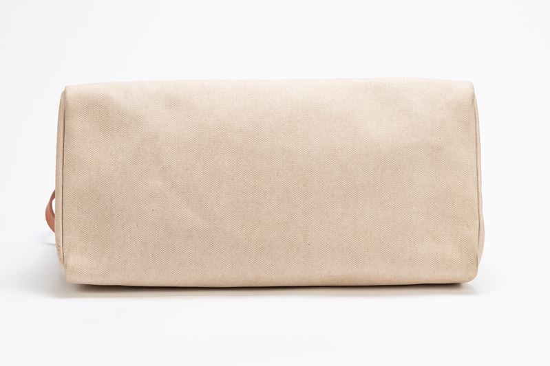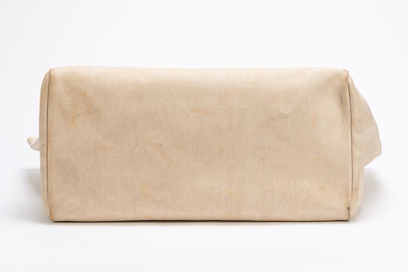 in tela color Ecru e vache naturelle con tracolla, dettagli Clou de selle in palladio, cm 50, con ricambio (importanti segni d'uso)Base d'asta