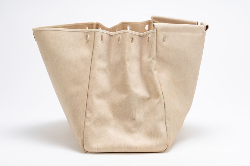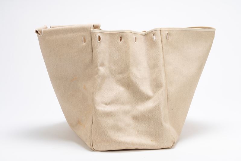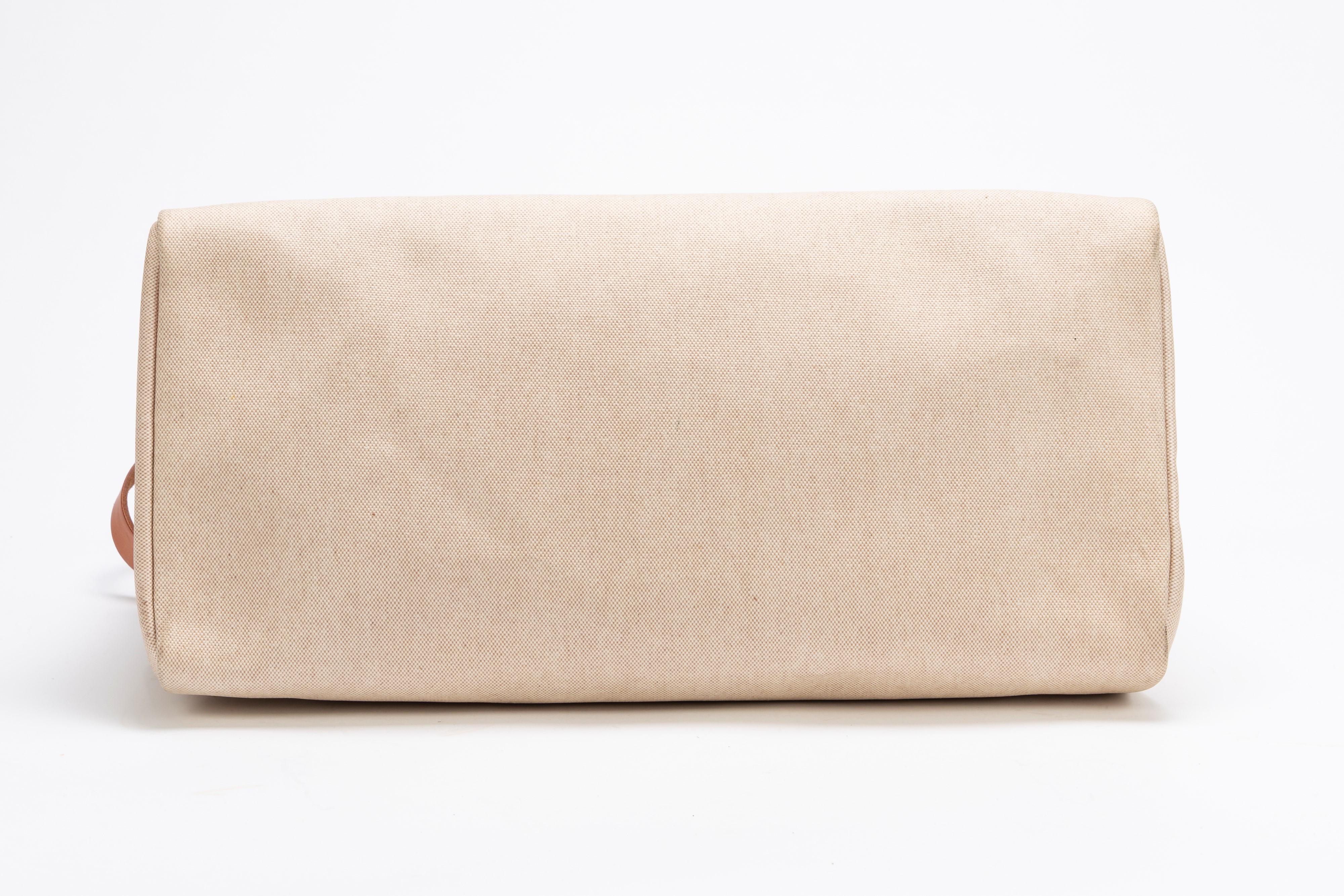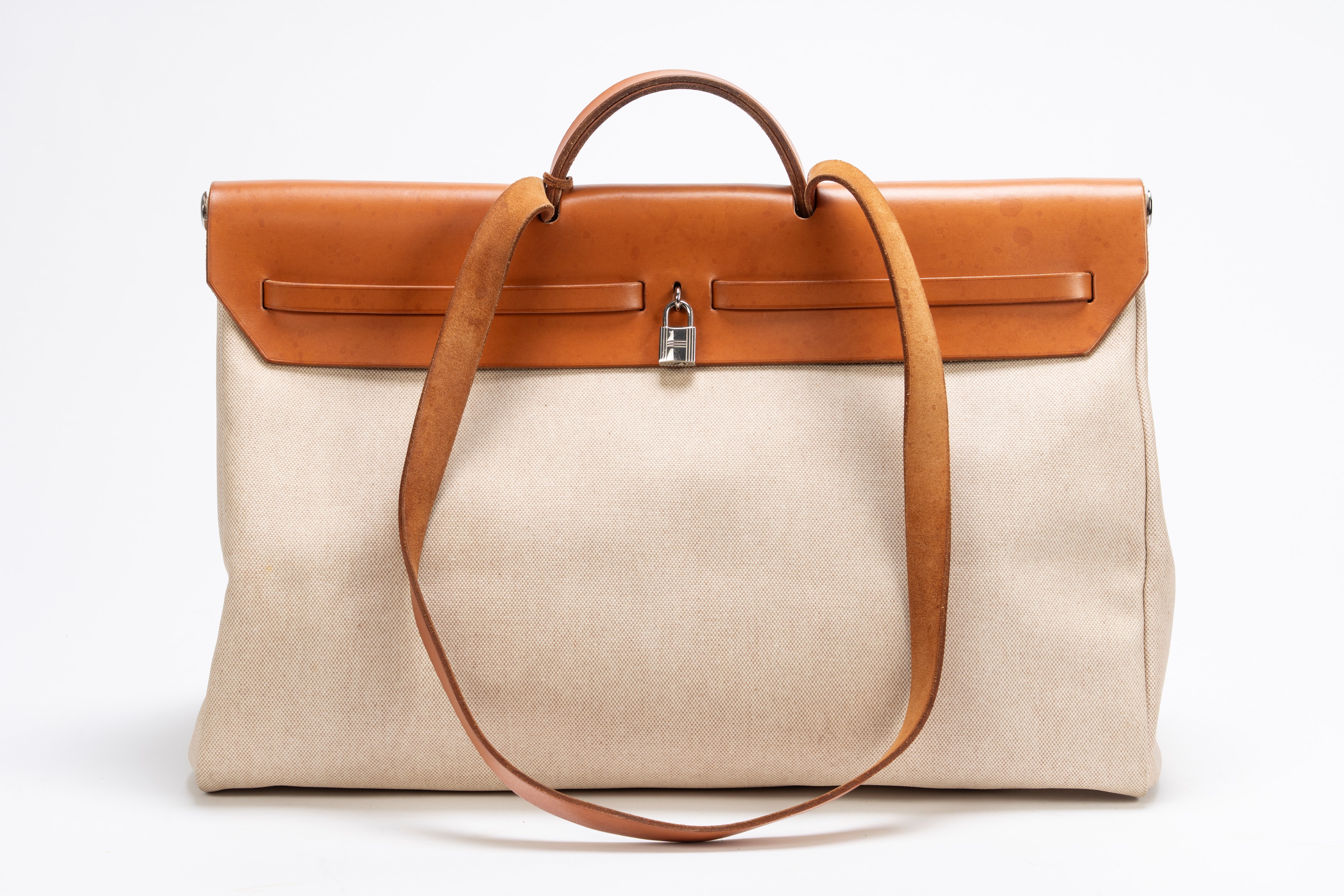 in tela color Ecru e vache naturelle con tracolla, dettagli Clou de selle in palladio, cm 50, con ricambio (importanti segni d'uso)Base d'asta