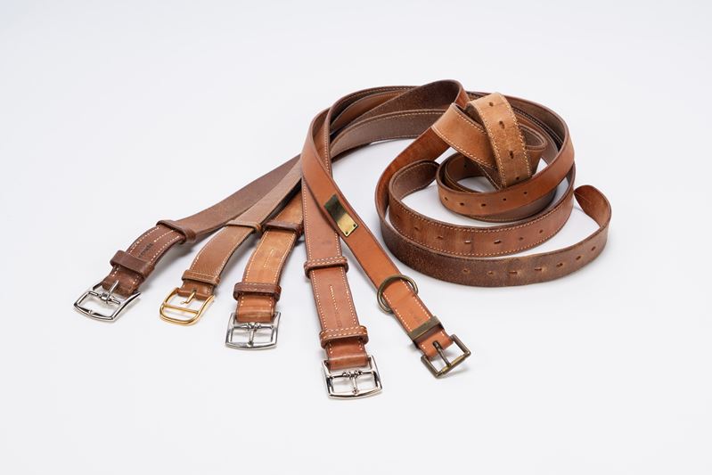 in pellami diversi, tonalità di marrone diverse, fibbie in metallo, misure diverse (segni d'uso)