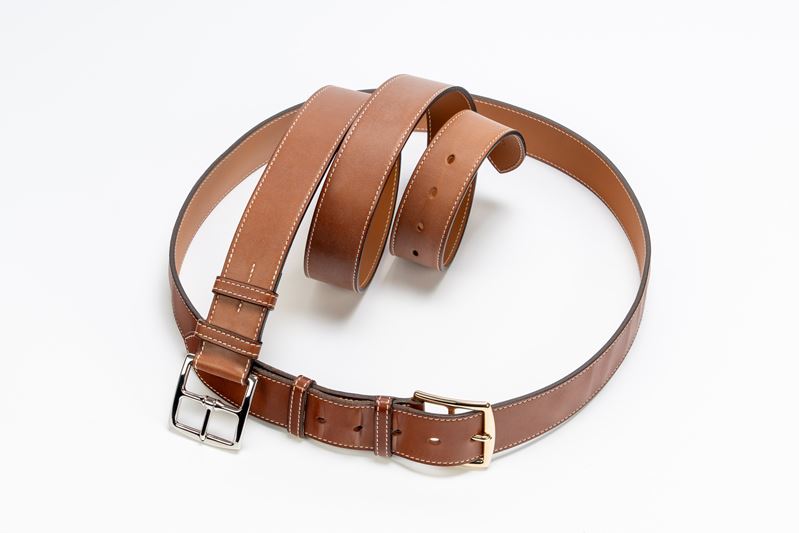 in pelle Barenia tonalità diverse, fibbie in metallo e metallo dorato, cm 105 e 115 x 4 (segni d'uso)Base d'asta