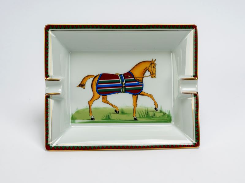 in porcellana bianca, decoro con cavallo in colori vari, bordo rosso, verde e oro, cm 19 x 16 (lievi segni d'uso)Base d'asta