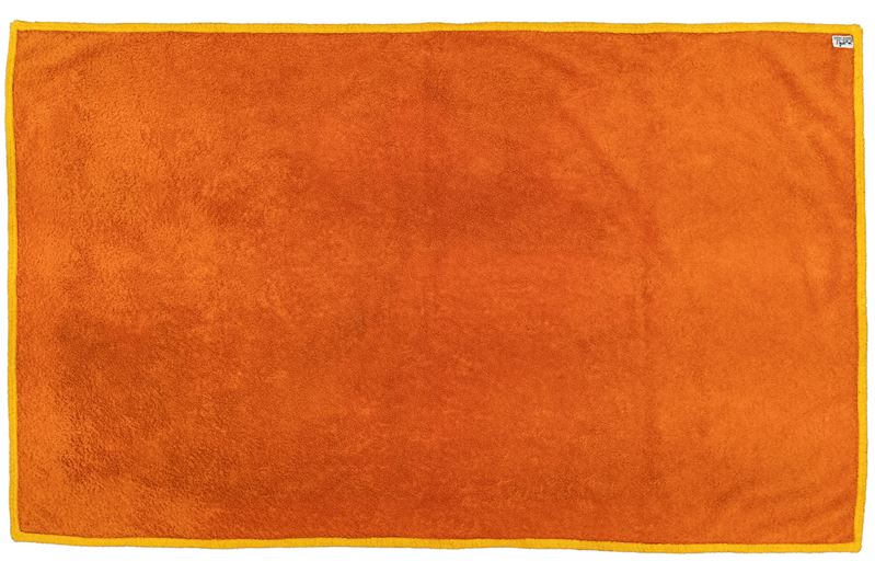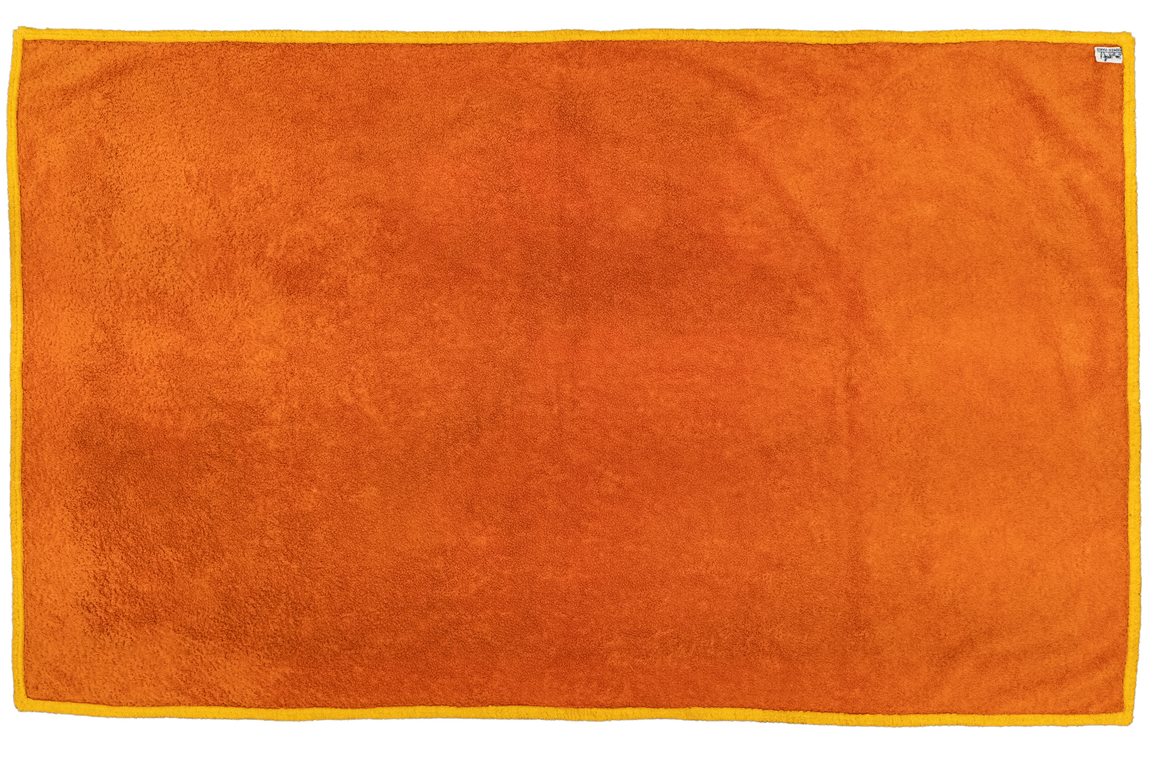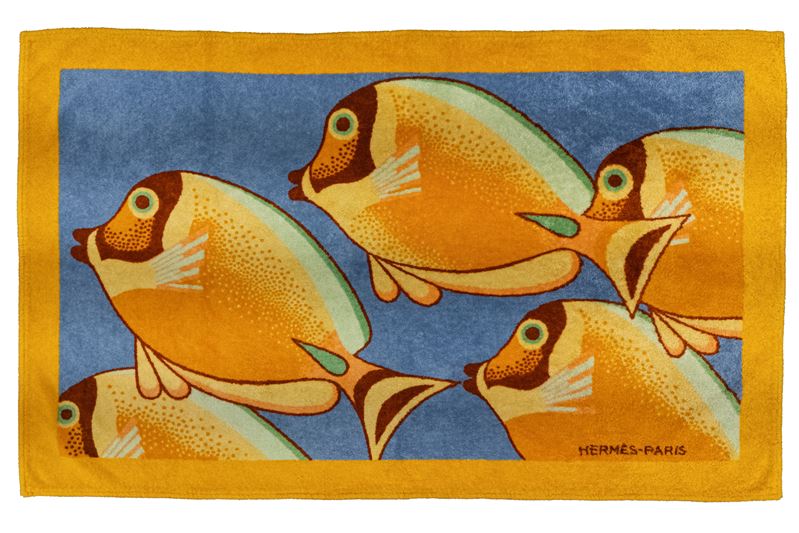 in spugna di cotone, stampa pesci multicolor, bordo color senape, cm 140 x 85 (lievissimi segni d'uso)Base d'asta