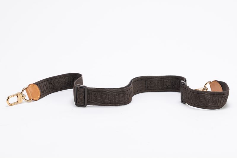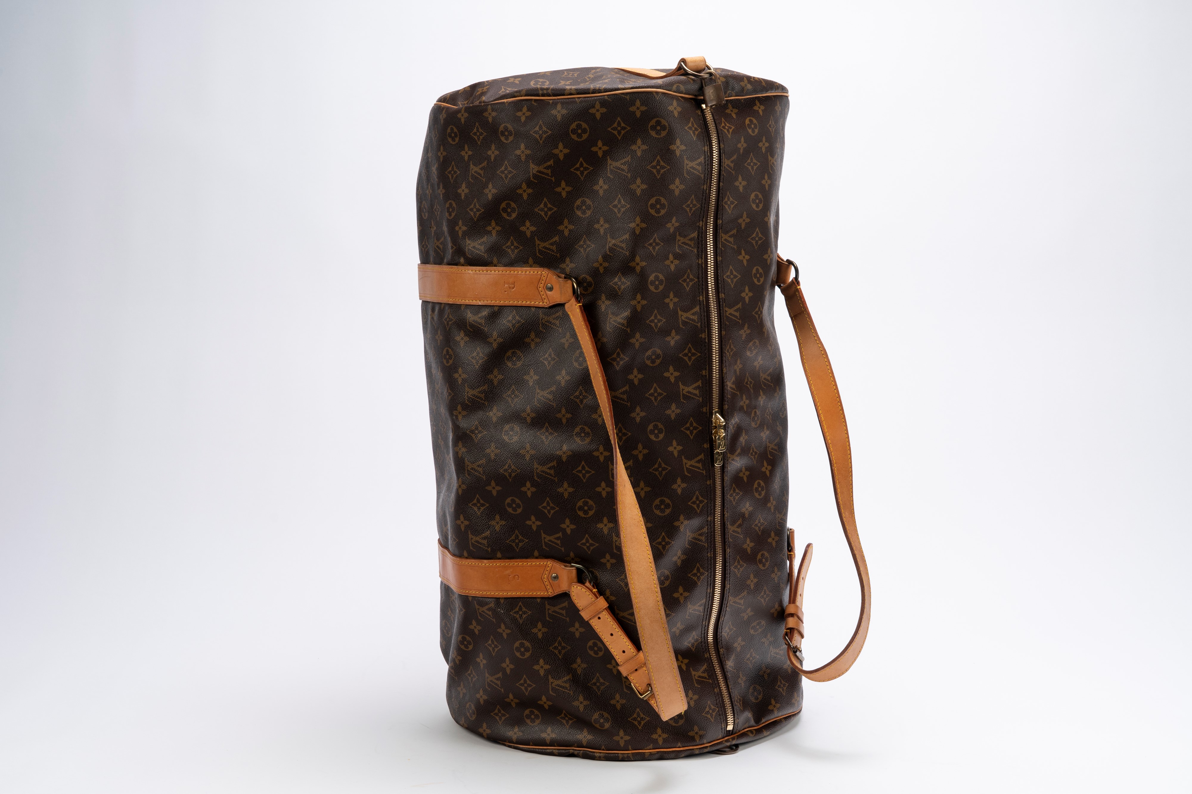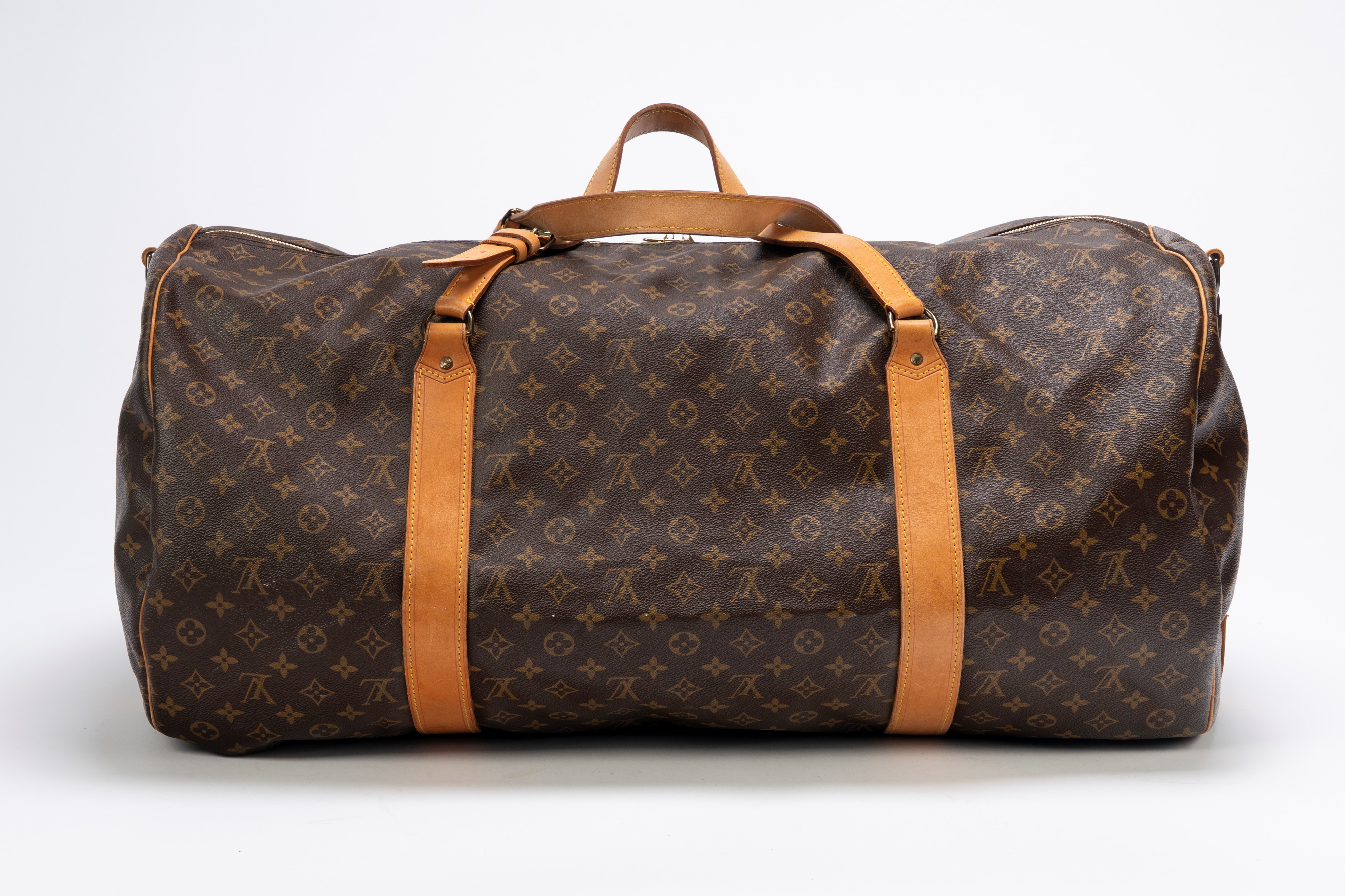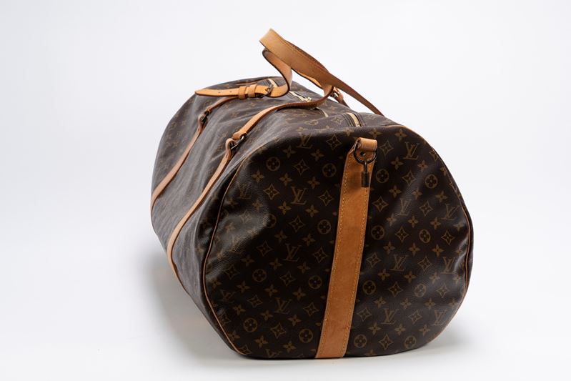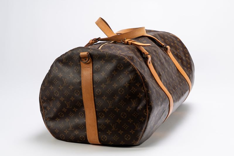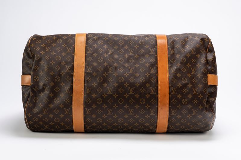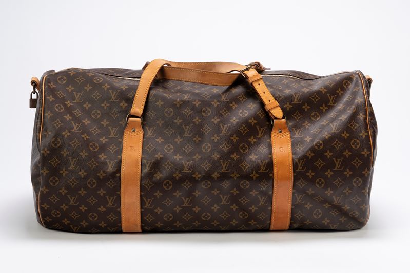 in tela monogram, doppi manici in cuoio, dettagli in metallo, tracolla staccabile, chiusura a zip, cm 70 x 40 x 35, mancante di chiavi (segni d'uso)Base d'asta