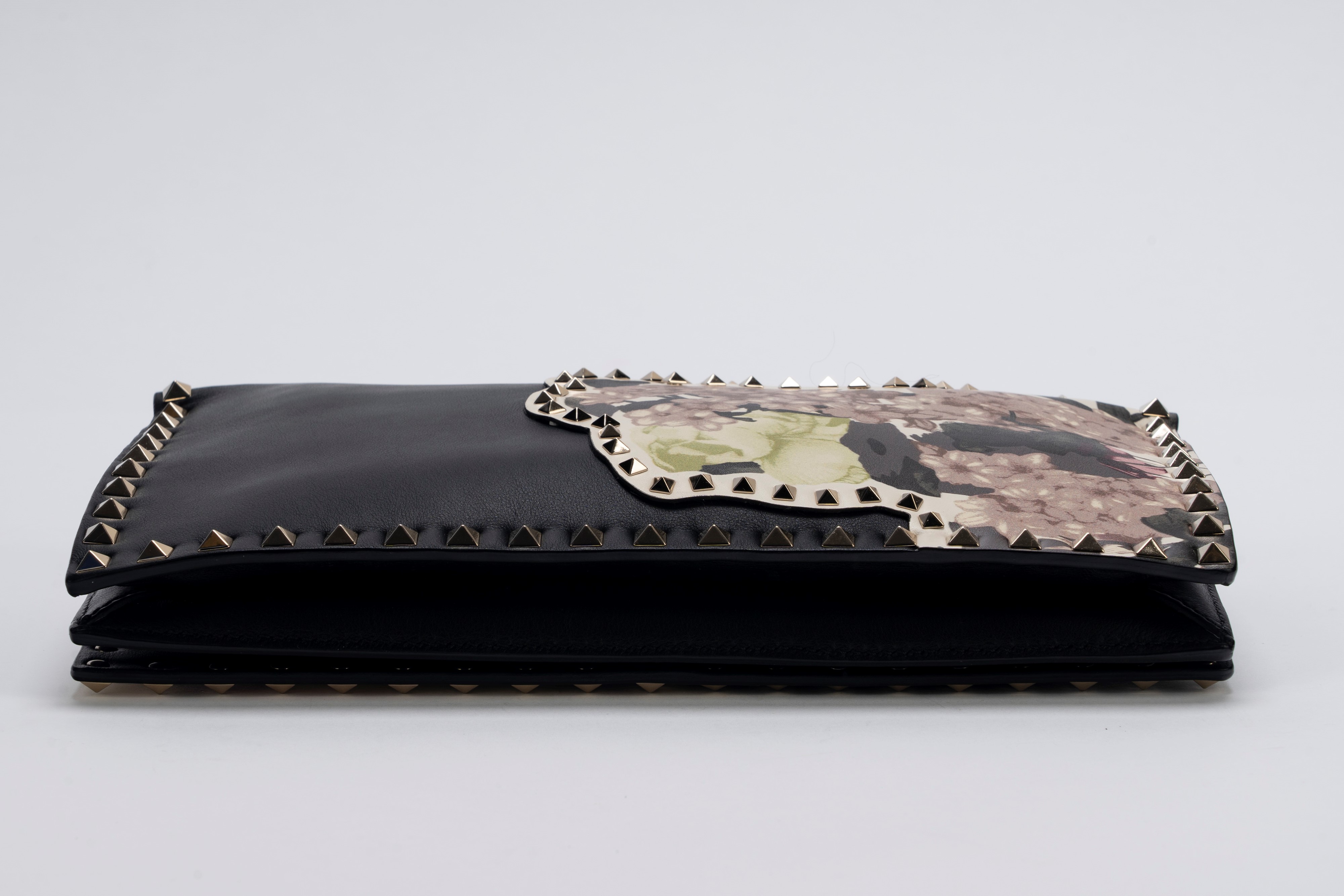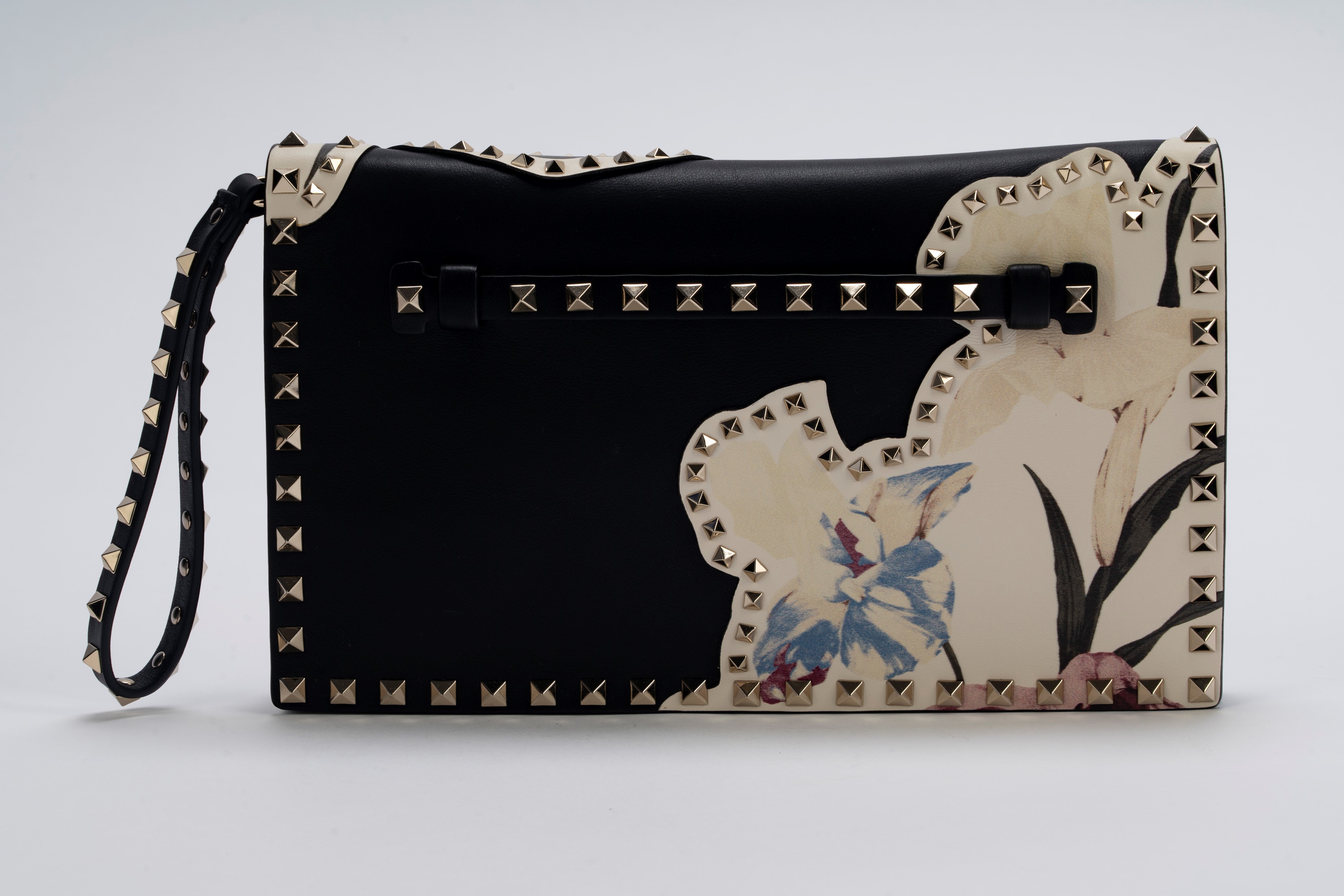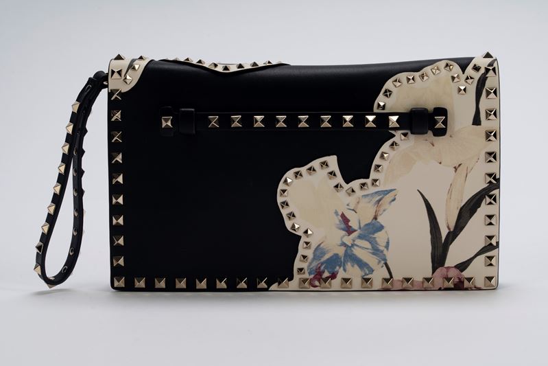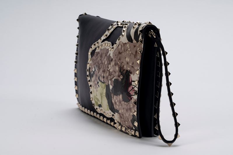 in pelle color nero, applicazioni a stampa floreale in colori vari, profili con borchie in metallo, manico staccabile, cm 28, con sacchetto (lievissimi segni d'uso)