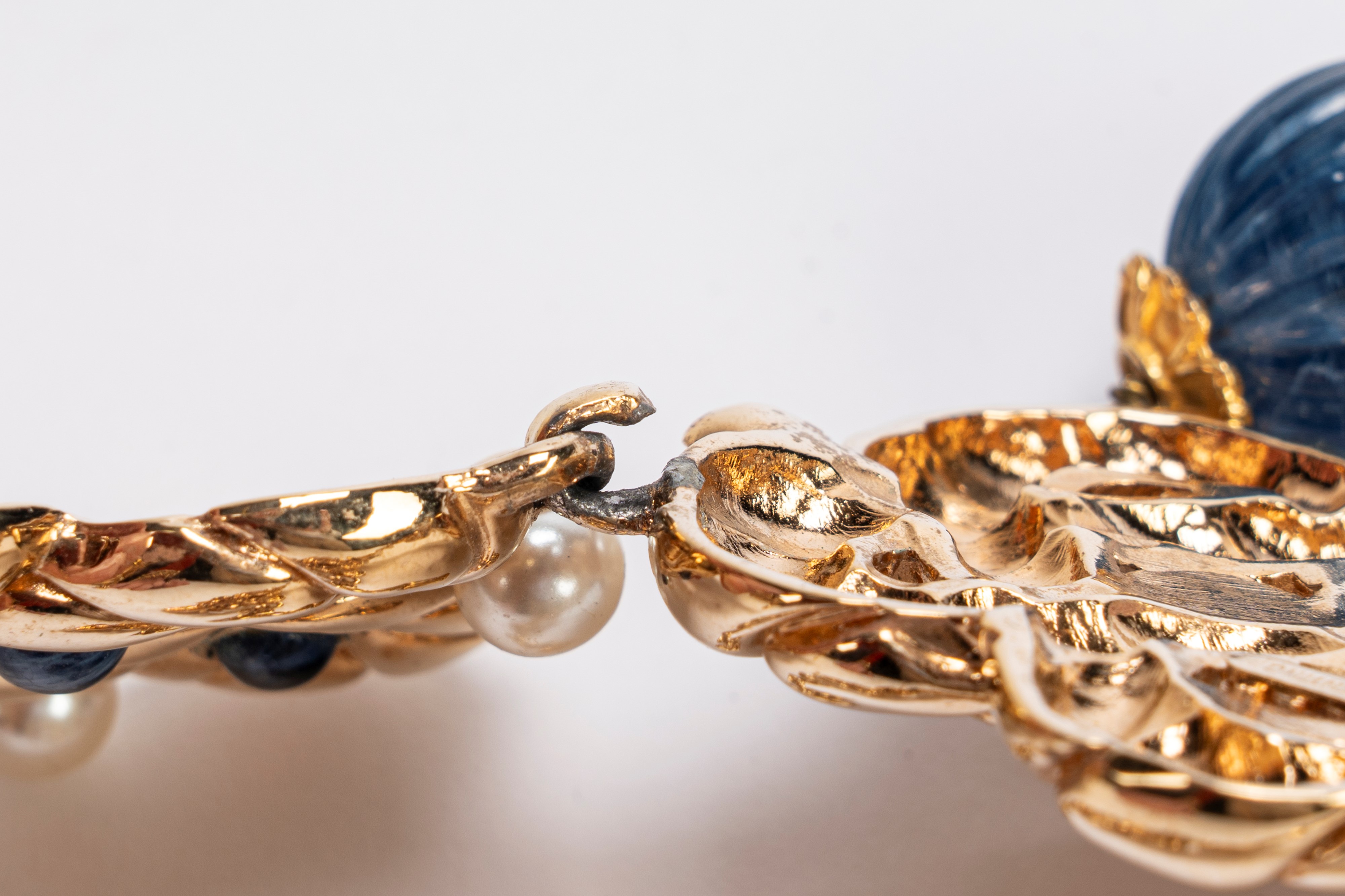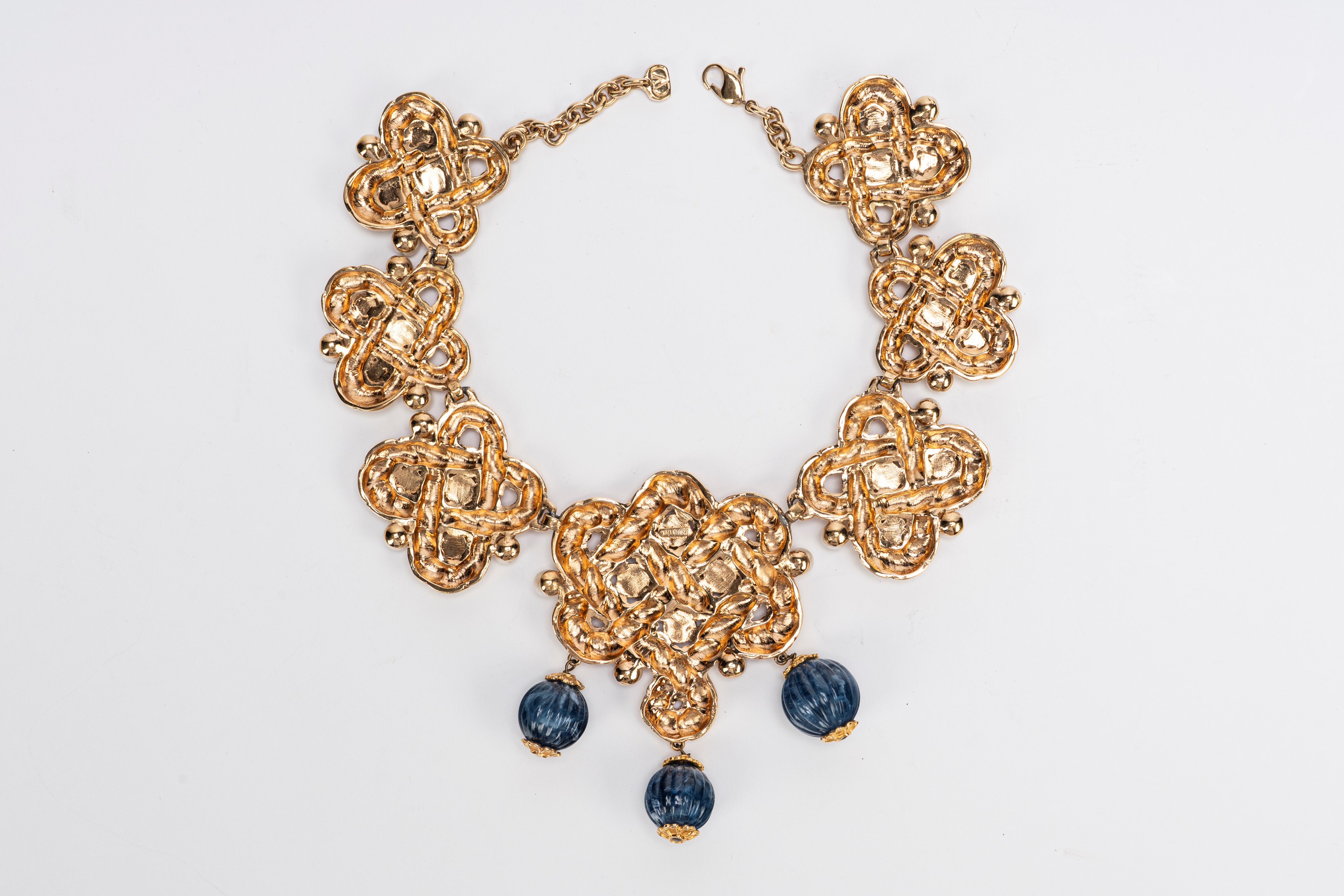 girocollo in metallo dorato, elementi a cordoncino con perle fancy e paste vitree color blu cabochon, tre boules pendenti a coste (lievissimi segni d'uso)Base d'asta