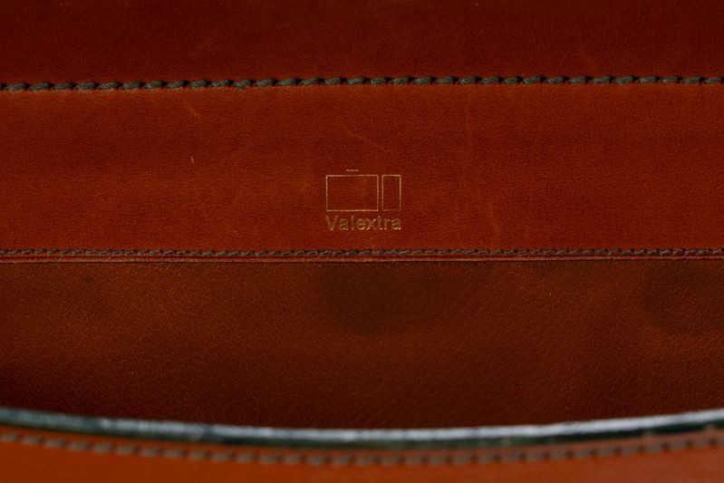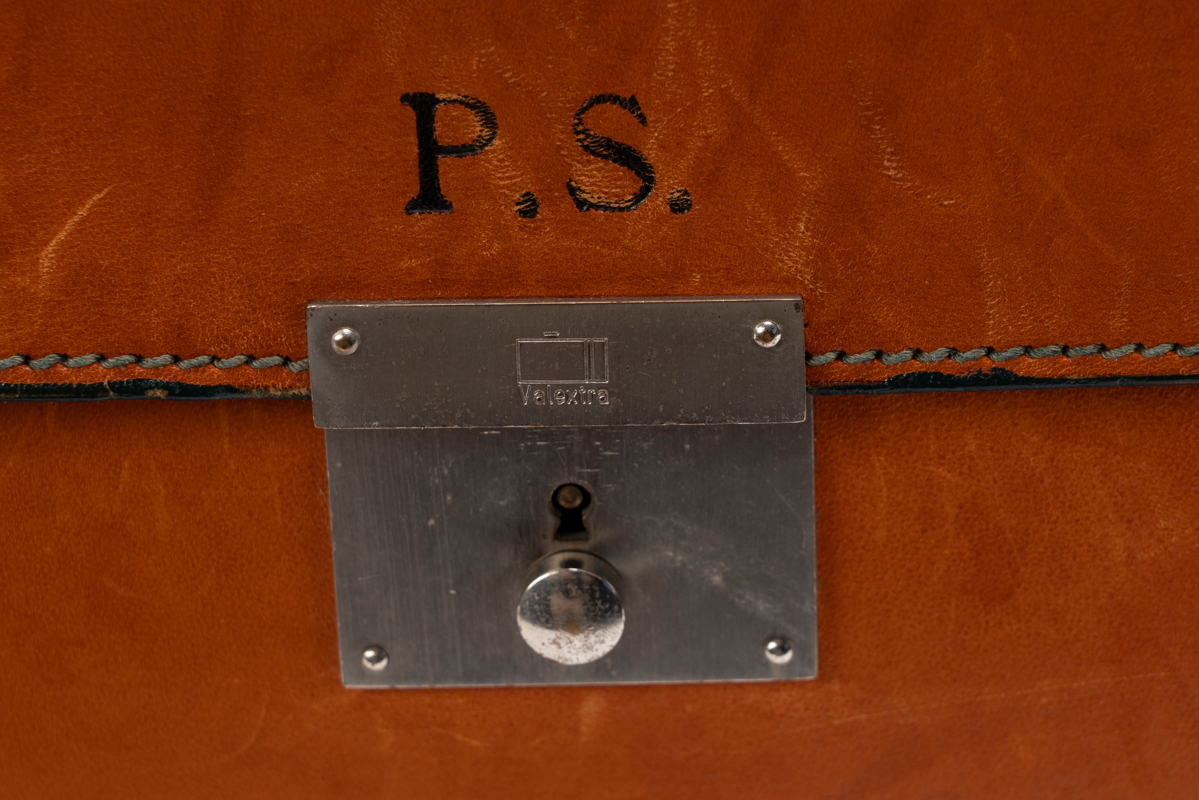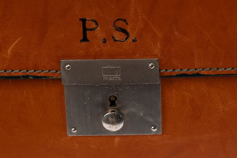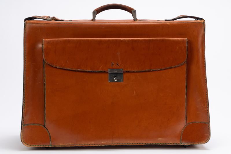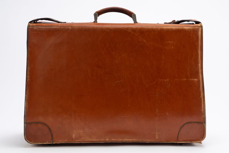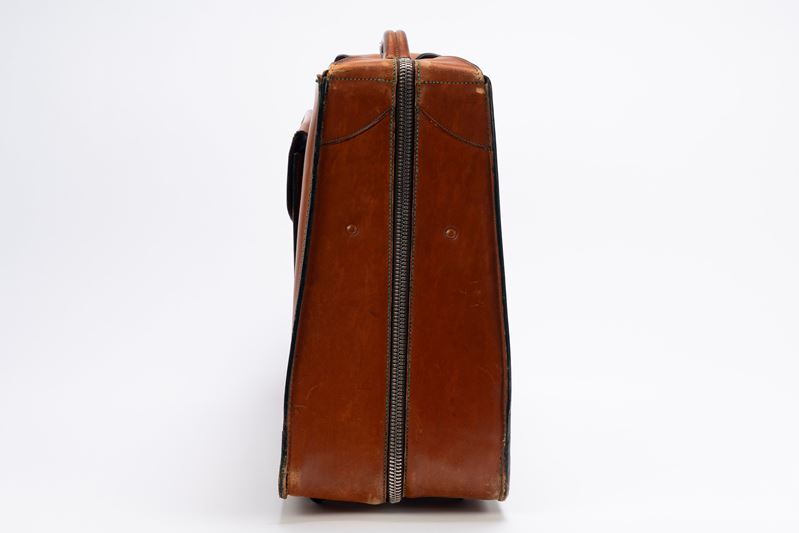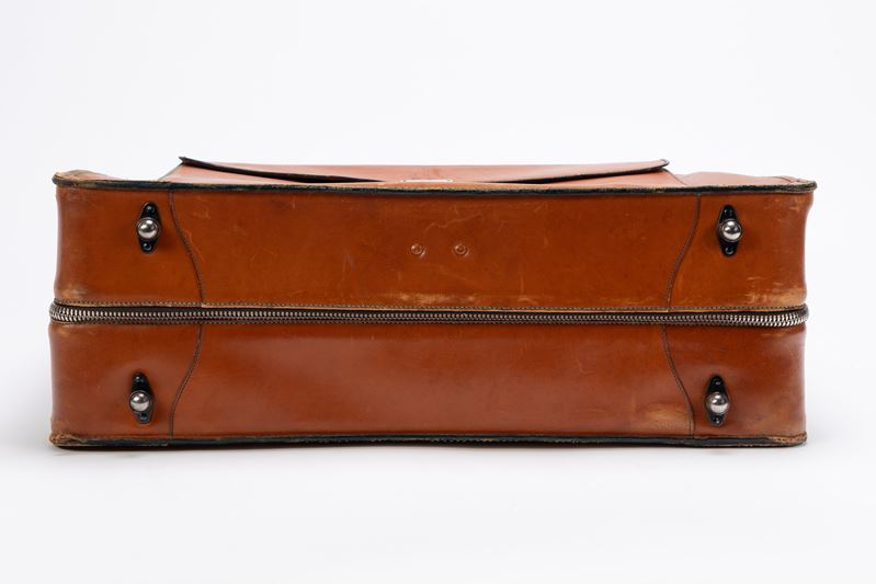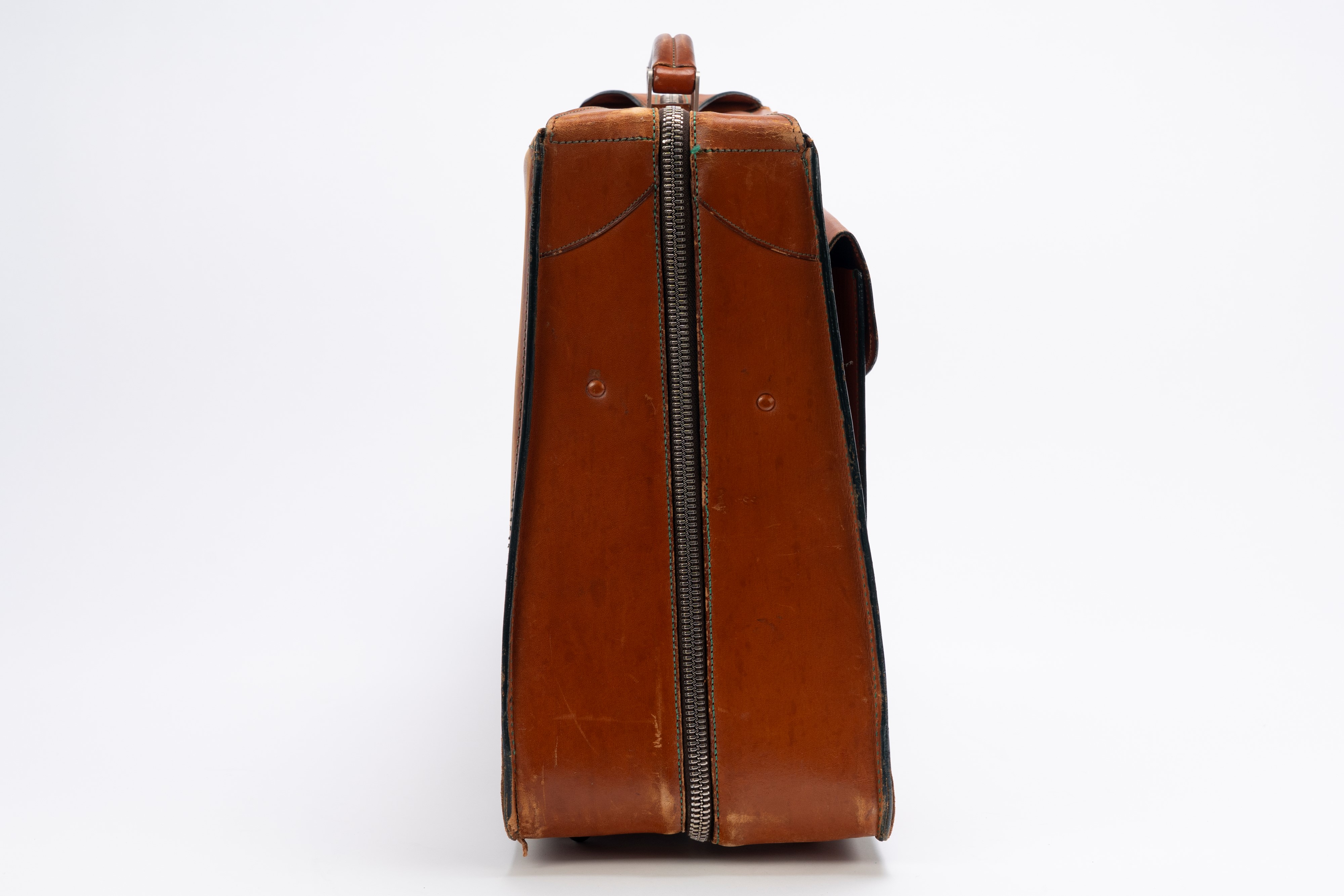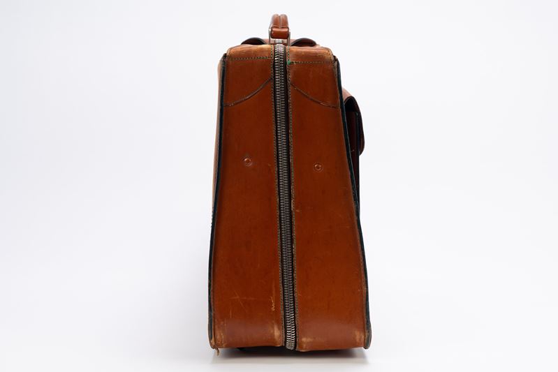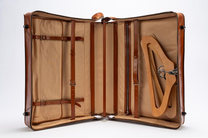 in cuoio, interno accessoriato con cinque grucce in legno e metallo, chiusura a cerniera, dettagli in metallo satinato, iniziali P.S., cm 58 x 20 x 40 (segni d'uso)Base d'asta