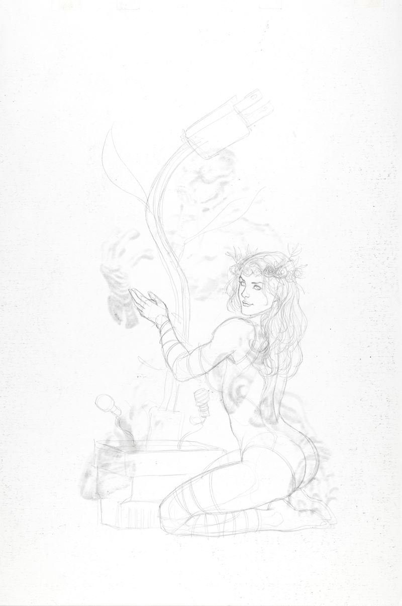 Originale di copertina realizzato da Cho per l'art book "Monsters and Dames", pubblicato e distribuito in edizione limitata in occasione dell'Emerald City Comicon nel 2009. Un'opera di grande impatto ed eleganza che rappresenta al meglio il genio visionario di Cho, qui alle prese con un meraviglioso tributo al classico cinematografico "Il mostro della laguna nera". Al retro uno studio preliminare a matita per Poison Ivy. Firmato.