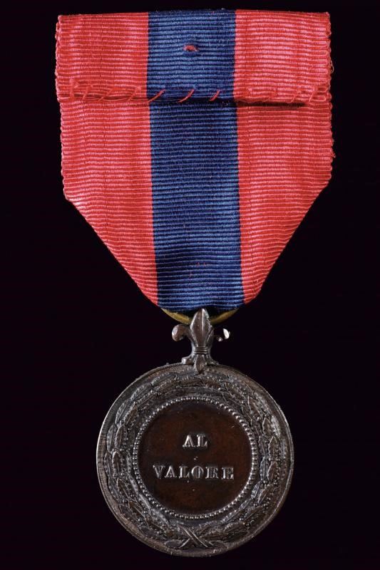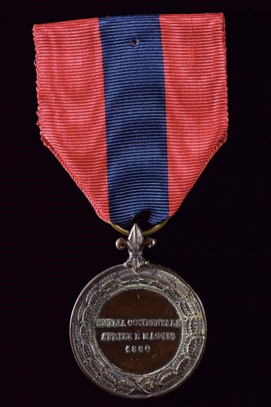 Medaglia per la campagna della Sicilia occidentale, aprile maggio 1860. In bronzo. Al dritto "AL VALORE", al rovescio "SICILIA OCCIDENTALE APRILE E MAGGIO 1860". Con nastro rosso con banda centrale color turchino. Molto rara.