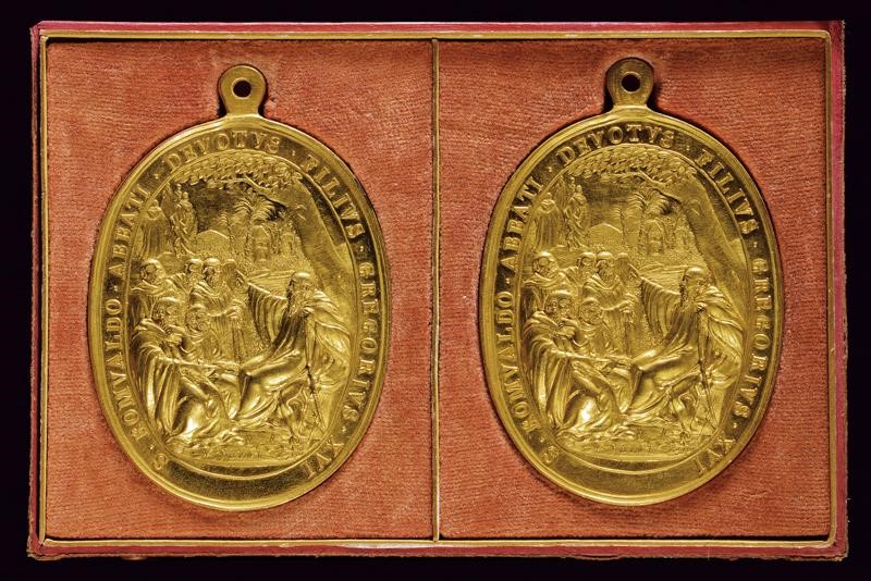 Due esemplari in bronzo dorato, privi di opus. In astuccio originale rivestito in marocchino rosso con decorazioni in oro; uno dei due ganci mancanti.
