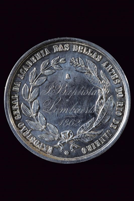 Medaglia premio accademia delle belle arti di Rio de Janeiro, in argento. Al dritto busto verso sinistra, al bordo "D. PEDRO II IMP. DO BRAS."; sul taglio del collo "G.LUSTER F." Al rovescio "EXPOSICAO GERAL DA ACADEMIA DAS BELLAS ARTES DO RIO DE JANEIRO"