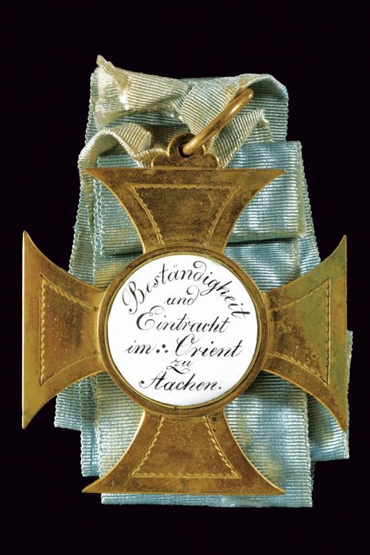 Della loggia di Aachen, con iscrizione "Beständigkeit und Eintracht im Orient zu Aachen". In metallo dorato, con medaglioni smaltati. Con nastro da collo in seta originale (danneggiata) color celeste.