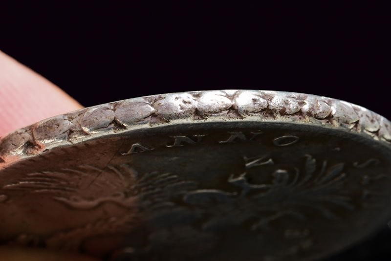 In argento. Al dritto busto verso destra, al bordo "CAROLVS. D.G. SIC ET.HIER.REX. HISP.INE". Al rovescio aquila coronata ad ali spiegate volta a sinistra, sotto lettere "F N"; al bordo "FAVSTO CORONATIONS ANNO / 175S(5)". 27 g.