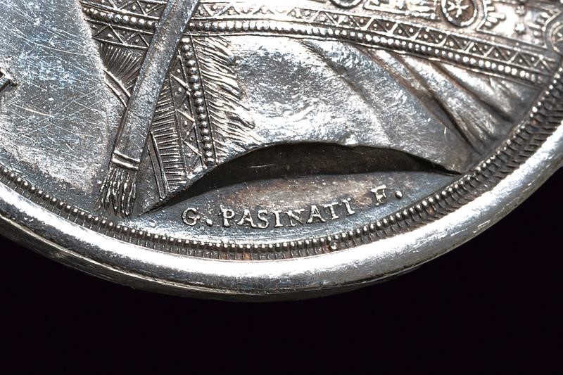 Recanti al recto busto a destra con iscrizione "PIVS VII P.M.AN.XV". Opus G. Pasinati. Al verso due guerrieri affiancano la colomba, sul bordo "VRBI ET ORBI RETITVTVS". Quella in argento con anello di sospensione. Quella in bronzo con piccola abrasione su