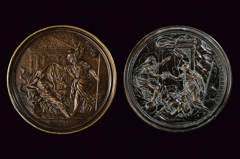 Due medaglie in bronzo con ritratto del medico e poeta, raffigurato con lunga parrucca. Iscrizione "FRANCISCUVS REDI PATRITIVS ARETINVS". Sul retro due scene differenti.