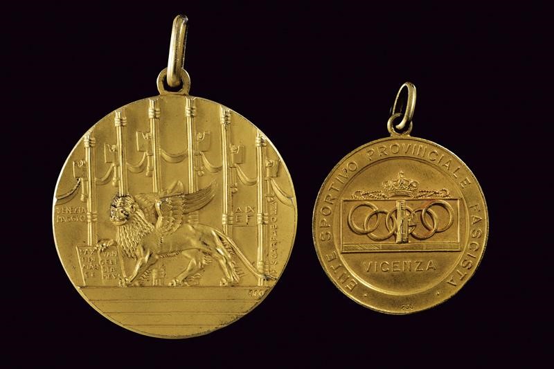 Entrambe in argento dorato (una con punzone "800", l'altra "900"). La prima "ENTE SPORTIVO PROVINCIALE FASCISTA / VERONA". L'altra con marcatura "FESTE INTERNAZIONALI DI EDVCAZIONE FISICA E SPORT", opus "F. SCARPABOLLA". Entrambe munite di anellino al som