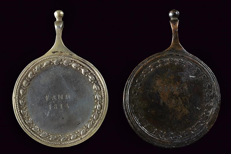Una in bronzo e una in argento. Al dritto "NAPOLEONE I IMP DE FRANCE E RE D'ITALIA". Al rovescio una marcata "FANO 1813" e una "OSIMO 1813". Le sommità con prolungamento e foro.