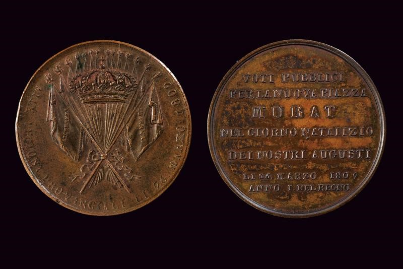 Una per i voti pubblici per la piazza. Sul recto testa a sinistra con iscrizione "GIOACCHINO NAPOL / RE DELLE DUE SICILIE". Sul retro iscrizione "OTI PUBBLICI/ PER LA NUOVA PIAZZA/ MURAT/ NEL GIORNO NATALIZIO/ DEI NOSTRI AUGUSTI/ LI 25 MARZO 1809/ ANNO I