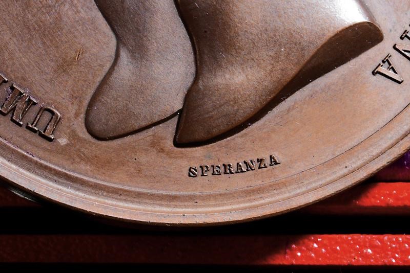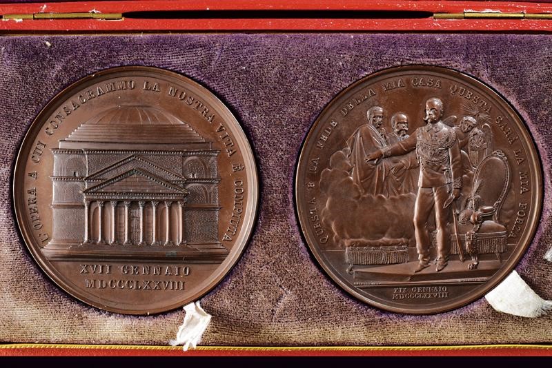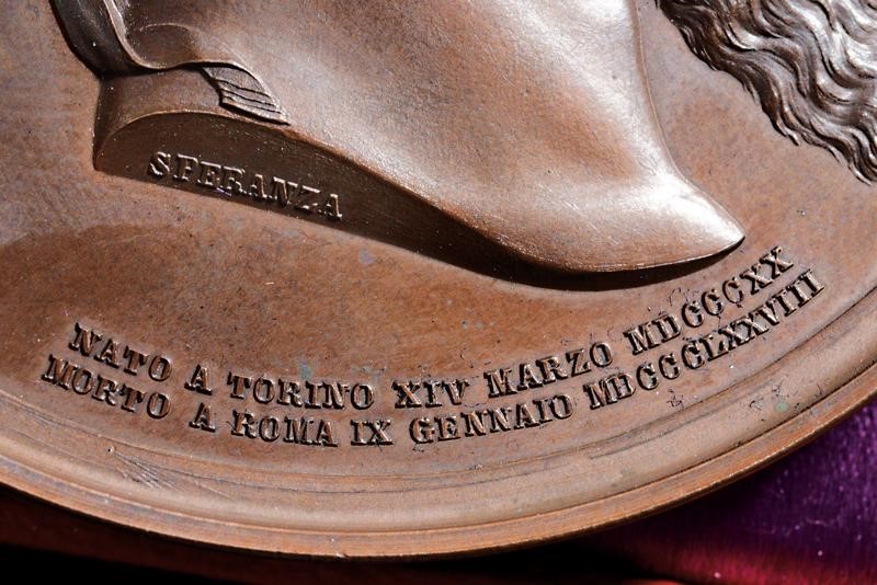 Entrambe in bronzo. La prima medaglia "Sepoltura al Pantheon", al dritto effige di Re VE II con una corona civica e al bordo "VITTORIO EMANUELE II RE D'ITALIA", sotto al collo opus "SPERANZA", in basso "NATO A TORINO XIV MARZO MDCCCXX / MORTO A ROMA IV GE
