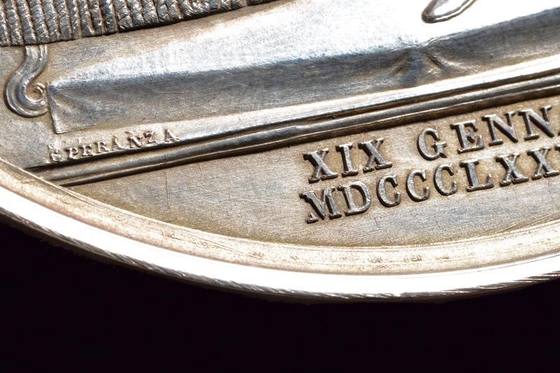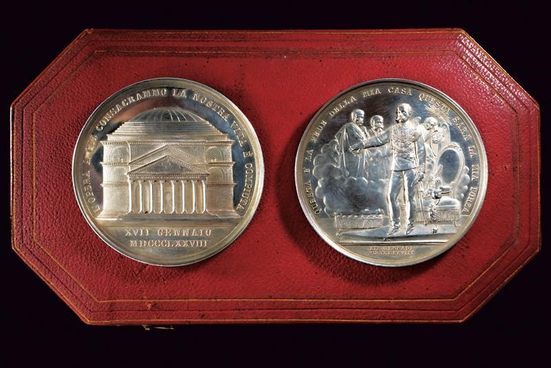 Entrambe in argento. La prima medaglia "Sepoltura al Pantheon", recante al dritto Re VE II con una corona civica e attorno "VITTORIO EMANUELE II RE D'ITALIA", sotto la troncatura opus "SPERANZA", in basso "NATO A TORINO XIV MARZO MDCCCXX / MORTO A ROMA IV