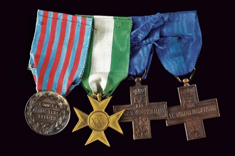 Medaglia della Guerra Italo-Turca 1911-12; croce di anzianità, 25 anni; croce al Valor Militare VE III e Al Valor Militare VE III. Spillate insieme.