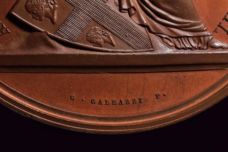 In bronzo. Al dritto figura allegorica della Sardegna in piedi su molo e volta a sinistra, coronata, regge cornucopia e ramo di corallo e posa il piede su prua di nave in mare agitato; al bordo "SARDEGNA / RISORGENTE", opus "G. GALEAZZI F". Al rovescio fi