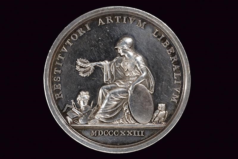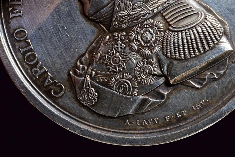 In argento. Al dritto busto con uniforme e decorazioni, sguardo verso sinistra; al bordo "CAROLO FELICI REGI OPTIMO ACADEMIA INSTAVRATA", opus "A. LAVY F. ET INV.". Al rovescio Minerva elmata seduta verso sinistra con scudo e corone di alloro, ai lati una