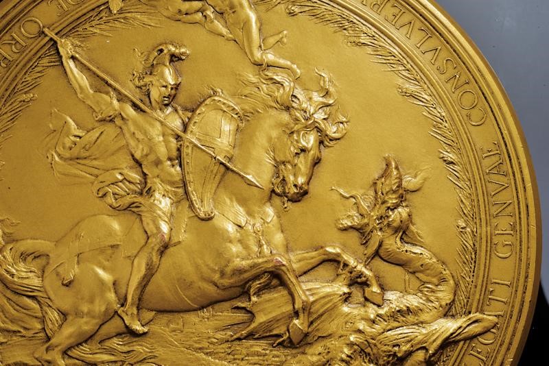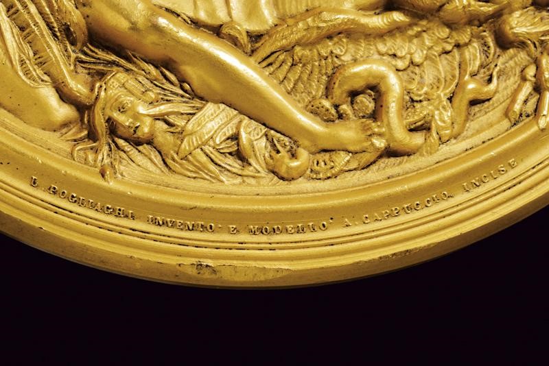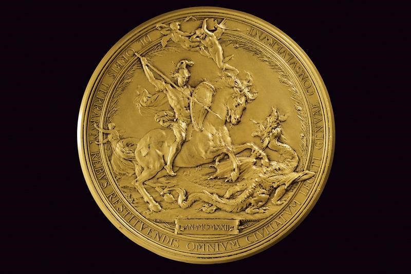 Ricordo del trattato di Rapallo 1922. Al recto busto di Cristoforo Colombo sormontante un'aquila e posto fra la figure allegoriche di una indiana e una dea che si stringono la mano, in altro il globo terracqueo. Al verso San Giorgio con il drago fra ange