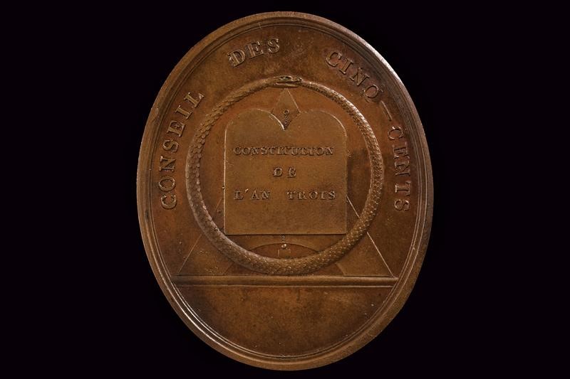In bronzo. Al dritto fascio fra fronde di quercia e di alloro, alla sommità "REPUBLIQUE FRANCAISE" in esergo "REPRESENTANT DU PEUPLE L'AN VII." Al rovescio "CONSEIL DES CINQ-CENT" e "CONSTITUTION DE L'AN TROIS".