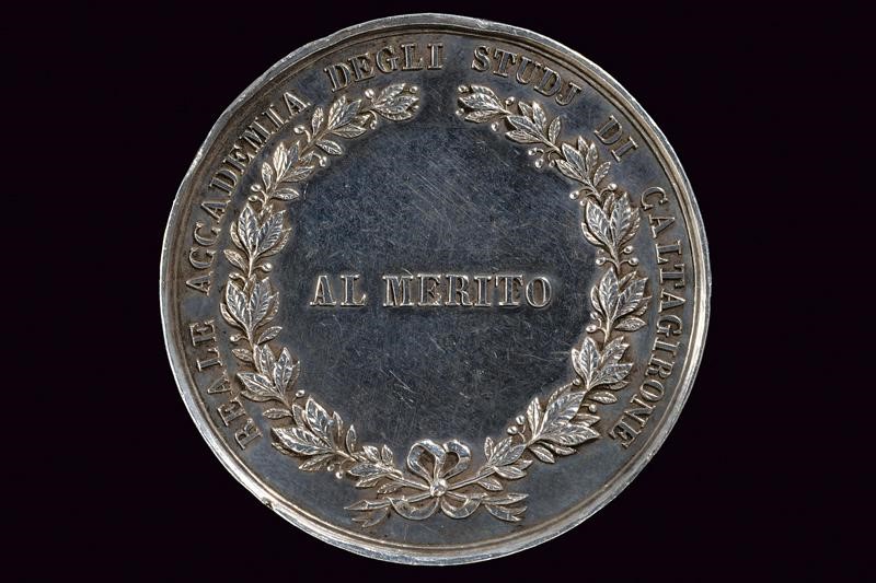 Sul recto busto in altorilievo a sinistra con iscrizione "FERDINANDO II RE DEL REGNO DELLE DUE SICILIE". Opus G. Barone. Sul retro "AL MERITO" in fine corona di alloro con iscrizione "REALE ACCADEMIA DEGLI STUDI DI CALTAGIRONE". 36 g.