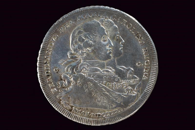 Sul recto busti accollati a destra con iscrizione "FERDINANDVS REX MARIA CAROLINA REGINA". Marcature "CC", "BP" e "R", sotto "NEAP MDCCLXXII". Sul retro figura femminile seduta verso sinistra con fanciullo in grembo, in fondo il Vesuvio. Iscrizione "FECUN