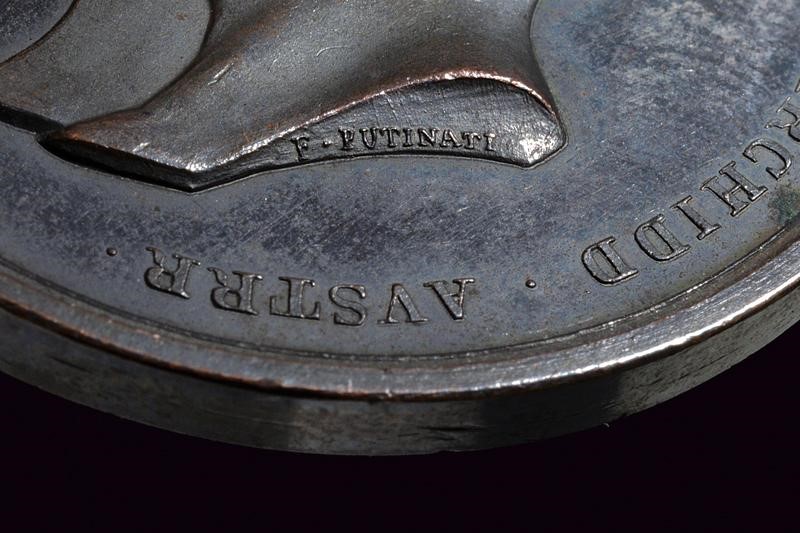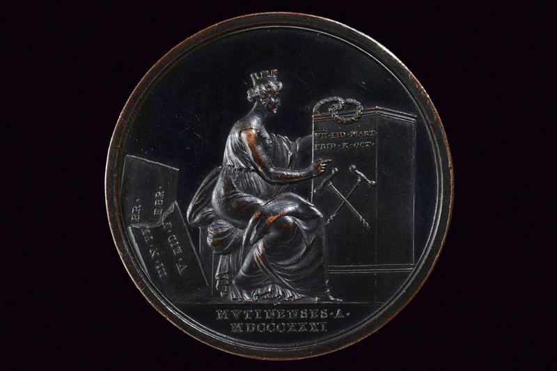 Al recto busti accollati a sinistra di Francesco IV e Maria Beatrice di Savoia. Al verso figura femminile seduta verso destra intenta a incidere un ceppo. Opus Putinati.