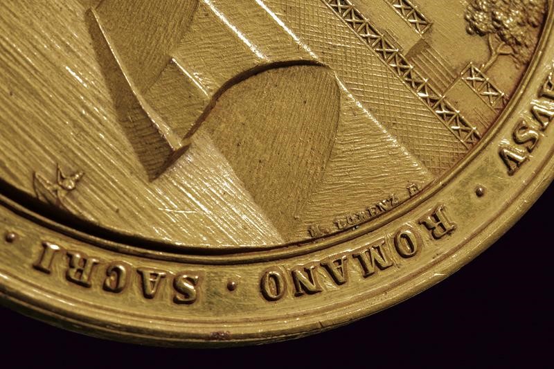 In argento dorato. Sul recto veduta dell’imbocco dei due nuovi cunicoli dell’Aniene di Monte Catillo con iscrizione "GREGORIVS XVI AVSV ROMANO SACRI PRINCIPATVS ANNO II INCHOAVIT V PERFECIT" Rv. Uscita dell’acqua dai due cunicoli, oltre la Grotta delle si