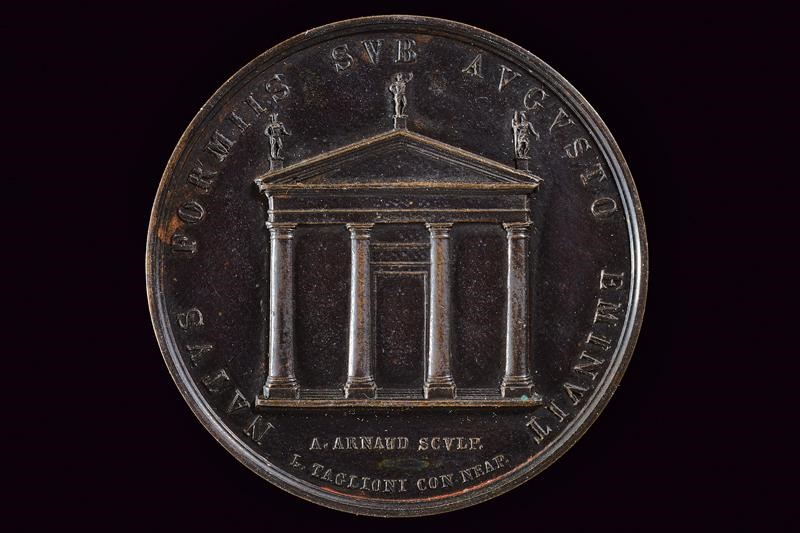 In bronzo. Al dritto busto verso destra, al bordo "M. VITRVVIVS POLLIO ARCHITECTONVM ANTESIGNANVS", opus "V. CATENACCI SCVL". Al rovescio prospetto anteriore di tempio quattrastilo, al bordo "NATVS FORMIIS SVB AVGVSTO EMINVIT"; sotto "A.ARNAUD SCVLP / L.