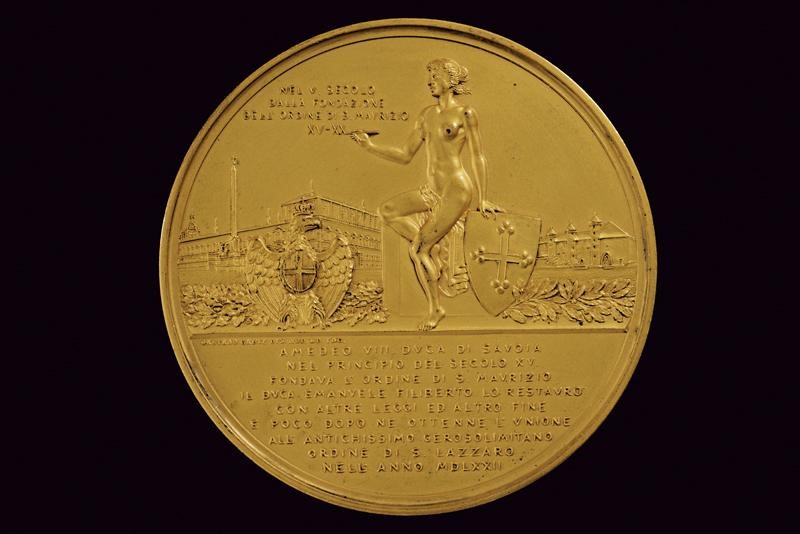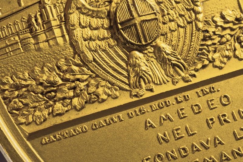 In bronzo dorato. Al dritto busti accollati di Vittorio Amedeo con turbante coronato e Vittorio Emanuele III con divisa militare, Croce Mauriziana e collare della SS. Annunziata; attorno "AMEDEO VIII DVCA DI SAVOIA - VITTORIO EMANUELE III RE D'ITALIA"; op