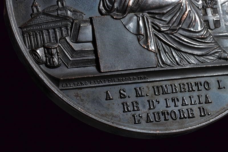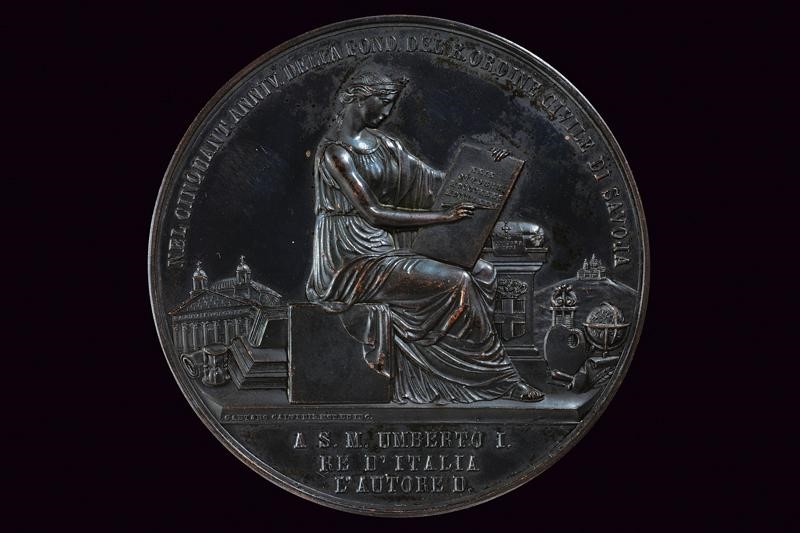 In bronzo. Al dritto i busti accollati dei tre Re con sguardo verso sinistra e al bordo "CARLO ALBERTO. VITTORIO EMANUELE II. Umberto I". Al rovescio figura allegorica della storia, alla sommità "NEL CINQUNT. ANNIV. DELLA FOND. DEL R. ORDINE CIVILE DI SAV