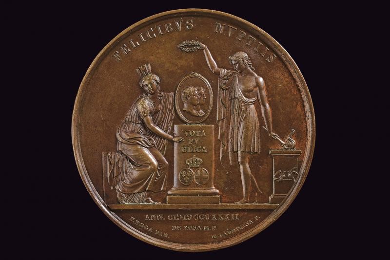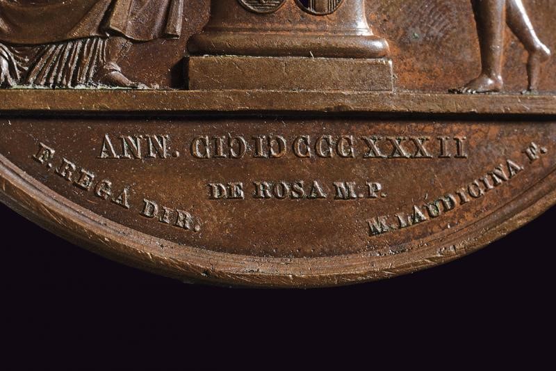 In bronzo. Al dritto busti affiancati a destra, al bordo "FERDINANDUS II. ET MARIA CHRISTINA REGNI VTR. SICIL. R. R."; opus "DE ROSA M. P. / F. REGA DIR. / M. LAUDICINA F.". Al rovescio nel campo figura allegorica turrita, seduta e volta di fronte, regge