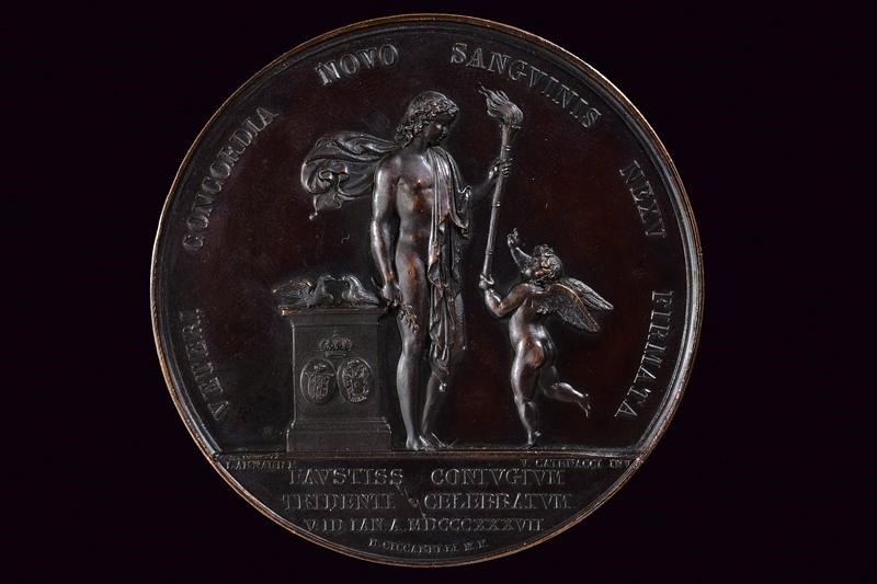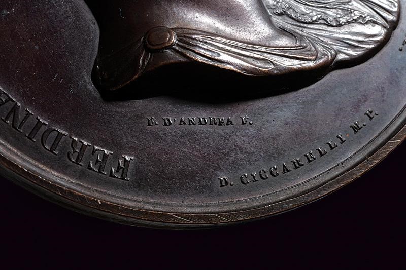 In bronzo. Al dritto busti affiancati verso destro, al bordo "FERDINANDVS II ET MARIA THERESIA AVSTRIACA REGNI VTR. SIC. R. R."; sotto "F. D’ANDREA F. / D. CICCARELLI M. P". Al rovescio Imene riceve una fiaccola da un genio alato, dietro, due colombe su c