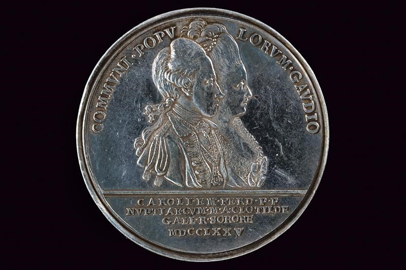 In argento. Al dritto busto a destra con parrucca, armatura, mantello e collare della SS. Annunziata; al bordo "VICTORIVS AMEDEVS III REX SARDINAE"; sul taglio della spalla opus "LAVY". Al rovescio busti affiancati a destra di Carlo Emanuele e di Maria Cl