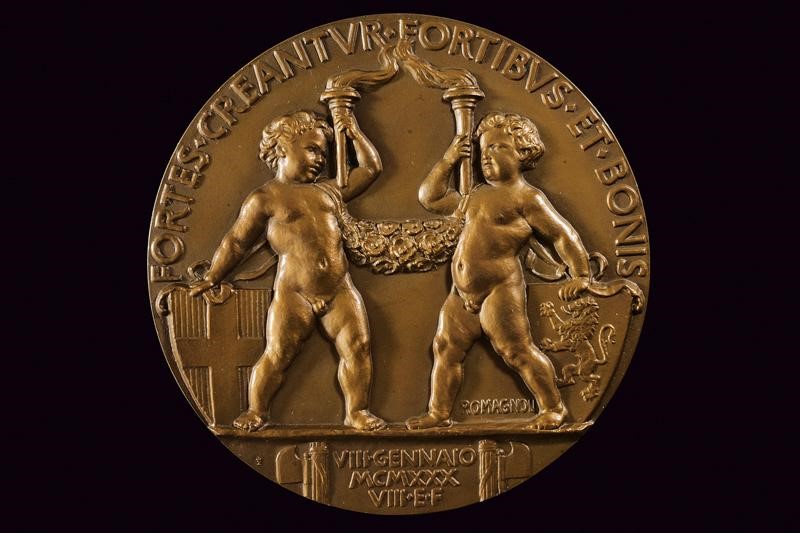 In bronzo. Al dritto busti accollati di Umberto II, con divisa, decorazioni e collare della SS. Annunziata, e di Maria Josè, con diadema e stola di pelliccia, intorno "VMBERTO DI SAVOIA E MARIA JOSE' DEL BELGIO" al bordo. Al rovescio due putti stanti e af