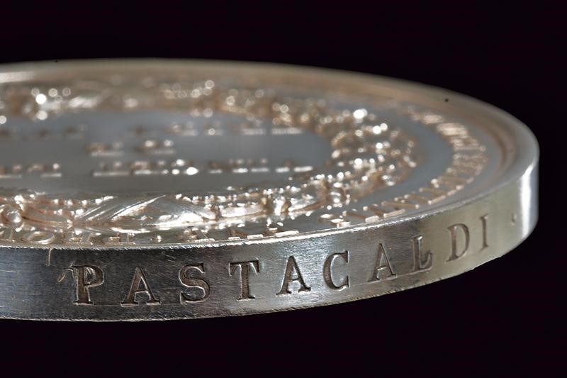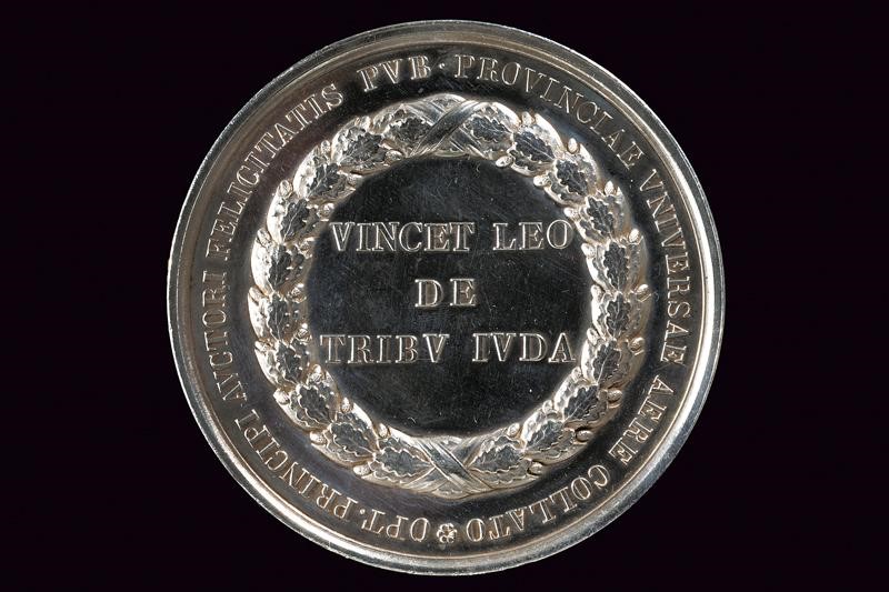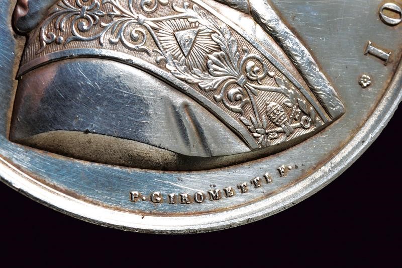 Al recto busto a destra, iscrizione "PIVS IX PONTIFEX MAXIMUS ANNO I", Opus "P. GIROMETTI". Al verso "VINCET LEO DE TRIBV IVDA" entro corona civica e con iscrizioni sul bordo. 100 g.