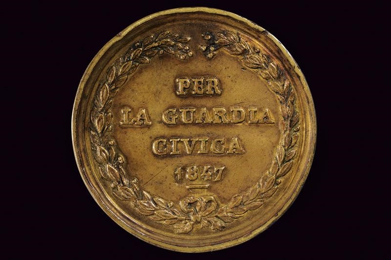 Al recto busto a sinistra "PIO IX PON MAS", Opus: Picioli. Sul retro "PER LA GUARDIA CIVICA 1847" entro serto di lauro. Intaccature.