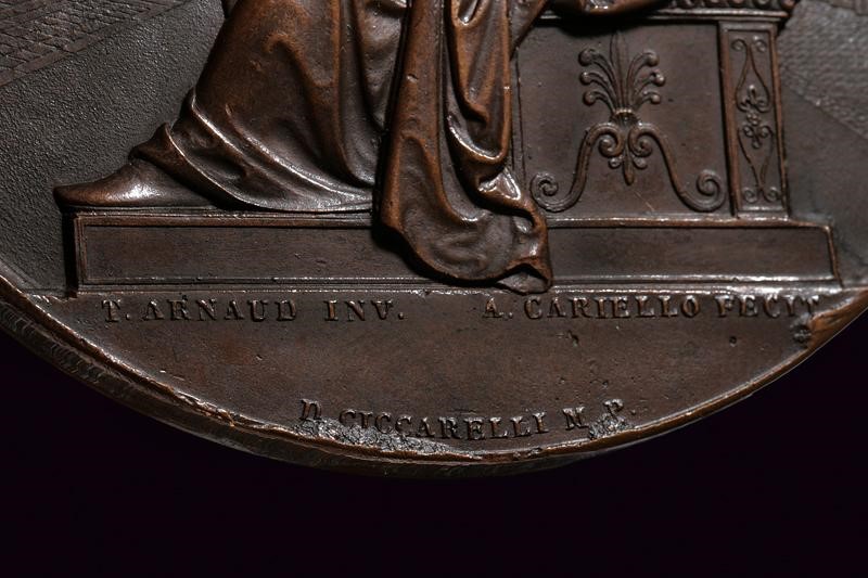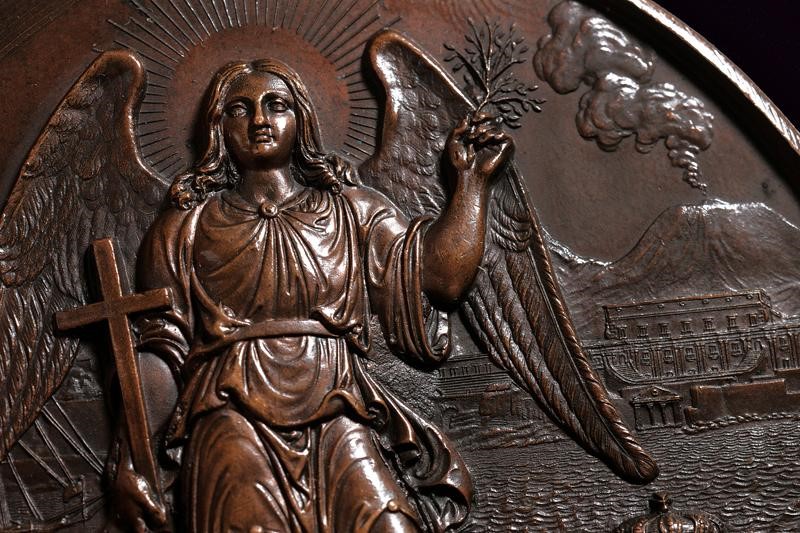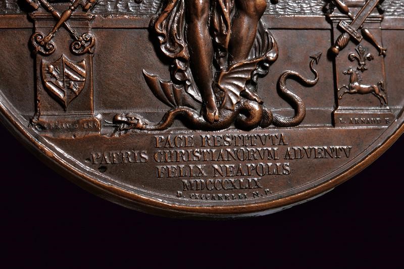 Il Papa a Gaeta. Al recto Pio IX seduto in trono benedicente verso sinistra. Al verso Angelo con croce, ai piedi il drago sconfitto; dietro parapetto con due capisaldi recanti gli stemmi e le insegne Papali e Reali, sullo sfondo il Porto di Napoli e il Ve