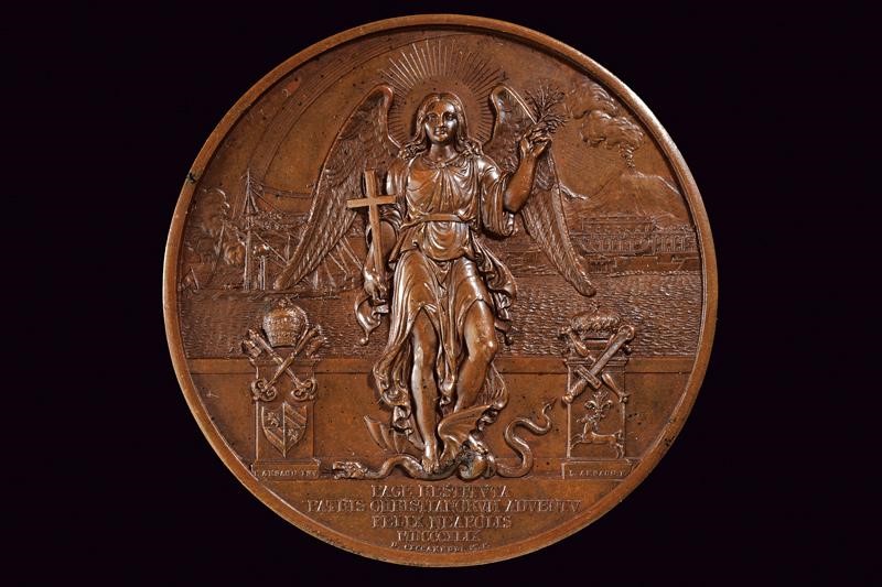 Il Papa a Gaeta. Al recto Pio IX seduto in trono benedicente verso sinistra. Al verso Angelo con croce, ai piedi il drago sconfitto; dietro parapetto con due capisaldi recanti gli stemmi e le insegne Papali e Reali, sullo sfondo il Porto di Napoli e il Ve