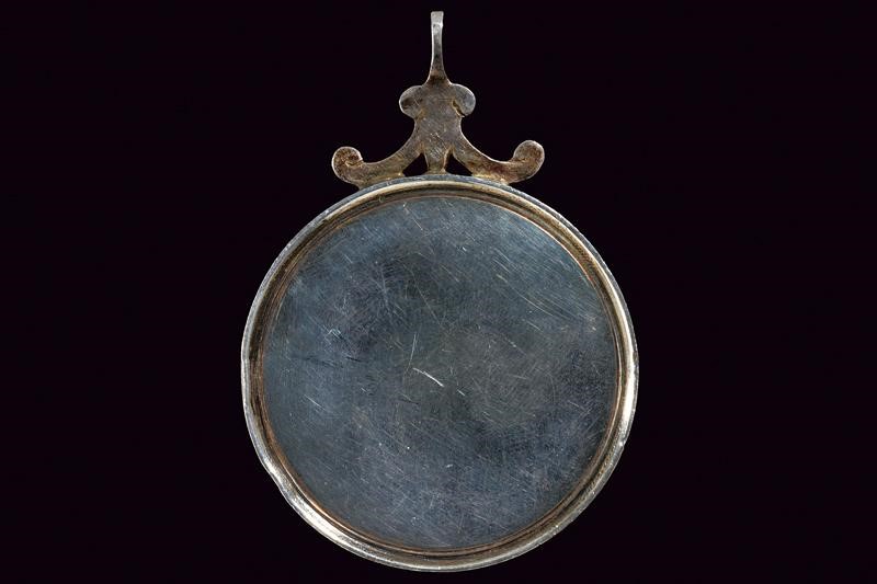 In argento; opus "G. NANNVCCI F". Il rovescio liscio. Il gancio alla sommità aggiunto in seguito. 38 g.
